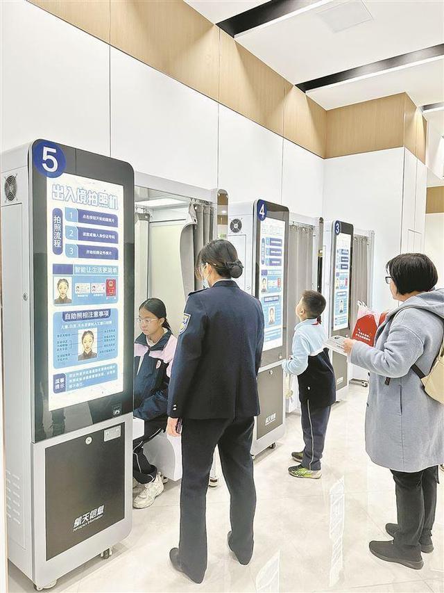 大厅里最先热闹起来的是拍照区。“小朋友下巴再抬高一点,红领巾要摘掉再拍哦。”厦门市公安局出入境管理支队第一大队民警王语正站在拍照机器前,一边示范一边提醒。