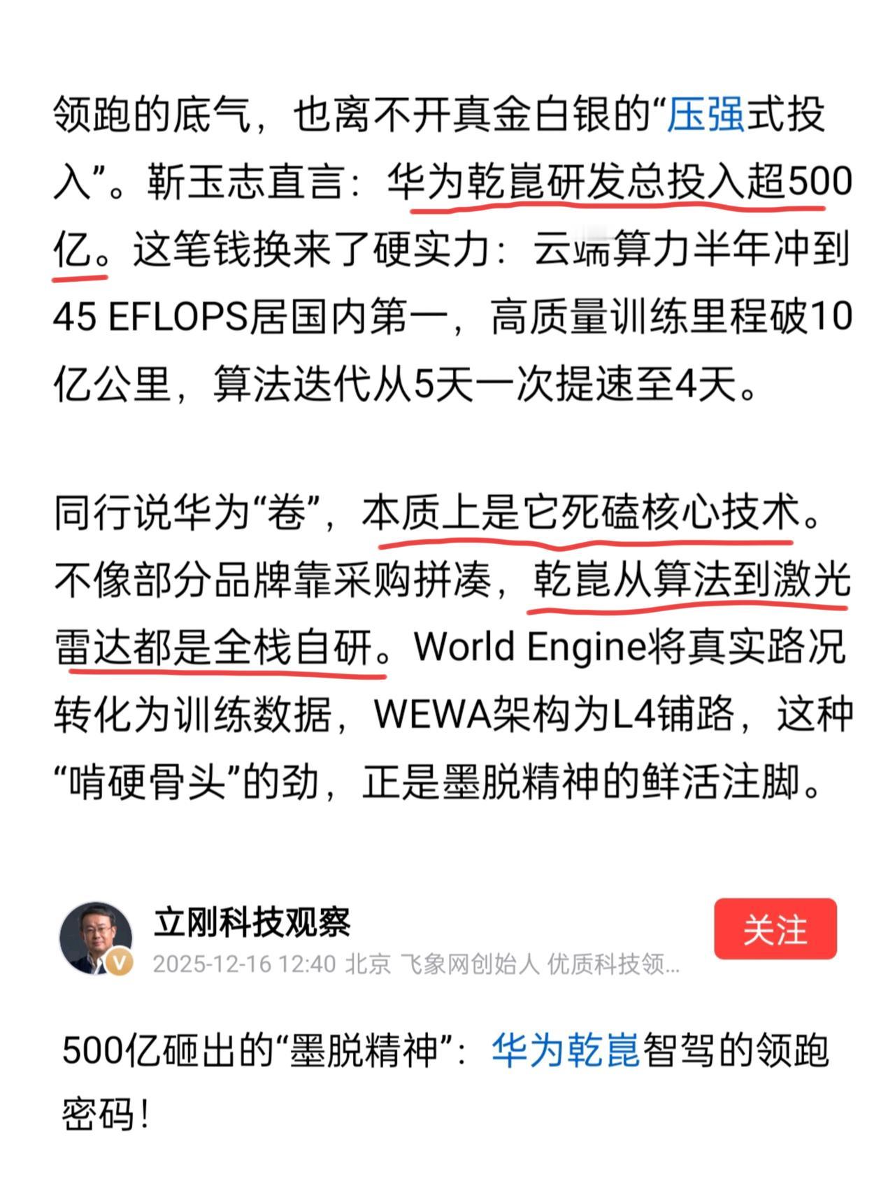 项立刚盛赞华为乾崑智驾。前不久,项立刚先生引用靳玉志的话表示,华为乾崑智驾的研发