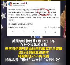 1月12日,特朗普在白宫签署一份颇具针对性的总统令,矛头直指与伊朗保持贸易往来的国家,威胁加征高达25%的关税,并号称“立即生效,不容谈判”。这项被普遍解读为针对中国的关税大棒,似乎意图复制其上一任期的战术。 然而,华盛顿的算盘声还未落,北京的回应已经抵达。就在次日,中国商务部发布本年度第3号公告,宣布对原产于美国和韩国的部分进口产品,征收高达113%的反倾销税。 特朗普政府的这份总统令,表面理由是对伊朗的持续压制。但此举的深层目标,显然是冲着中国与伊朗在能源、基础设施建设等领域日益紧密的合作关系去的。美国财政部长贝森特近期在多个场合的表态,也印证了华盛顿试图用经济手段来贯彻其外交战略的意图。 根据中国商务部的公告,经过严谨的调查程序,认定从美韩进口的相关化工产品和电子零部件存在倾销行为,并对国内产业造成了实质性损害。因此,依据国内相关法律和世贸组织规则,征收113%的反倾销税完全合规合理。 从美方签署命令到中方发布公告,间隔时间如此之短,这种精准、迅速的反制,绝非临时起意,更像是一套早已预备、引而待发的标准应对程序。中国的每一项贸易措施都建立在事实与规则基础之上。这种“你出拳,我接招,随即还手”的节奏,背后是实力与底气的支撑。 这份底气从何而来?核心在于中国经济结构的深刻变化。中国拥有全球最完整、规模最大的工业体系,内循环的根基日益牢固。庞大的国内市场本身就是一个巨大的“缓冲垫”和“稳定器”,能够有效吸收外部冲击。 过去几年,中国与“一带一路”沿线国家及地区贸易额的持续增长,进一步推动了贸易伙伴的多元化。根据2025年的数据,中国对传统主要市场的贸易依赖度已呈下降趋势,朋友圈的扩大意味着回旋余地更广。 反观美国,多家研究机构的数据早已证实,其加征的关税成本,大部分最终由其本国企业和普通消费者买单,这种内部矛盾与撕裂,持续消耗着其政策的效力。 国际社会的反应也耐人寻味。对于美国此次针对伊朗贸易的“长臂管辖”式加税,欧盟和俄罗斯等主要经济体均表达了批评和关切。这表明,单边主义的蛮横做法越来越不得人心。 当今世界的贸易规则,正在朝着更加多边、更加注重协商的方向演进。美国“一家说了算”的模式正在遭遇现实的阻力。各国基于自身发展需求和能源安全考虑,与伊朗等资源国建立正常的经贸合作,是市场的自然选择,很难被一纸单边禁令完全切断。 这种多极化趋势的显现,为受压制国家提供了更多的外交与经贸空间。 短期来看,这一轮摩擦必然会让部分相关企业承受成本上升的压力,全球供应链的某些环节也可能产生波动。但从长期视角观察,中美经济早已深度融合,你中有我、我中有你的局面决定了“全面脱钩”既不现实,也代价高昂。 摩擦可能会成为某种“新常态”,但合作的需求同样真实存在。对于中国而言,应对策略清晰而坚定:坚持高质量发展道路,持续推动科技自立自强,不断提升经济的韧性和抗风险能力。正如我们一贯坚持的原则,对话的大门始终敞开,但若有人选择施压,我们也必定奉陪到底。 中国的每一步回应都稳扎稳打,立足于自身的发展节奏。这份从国家实力中生长出的信心,以及由此为每一个普通人所守护的发展空间与未来可能性,本身就是对任何无端施压最坚实、最有力的回应。 特朗普称将对伊朗商业伙伴加征25%关税.--中国青年网