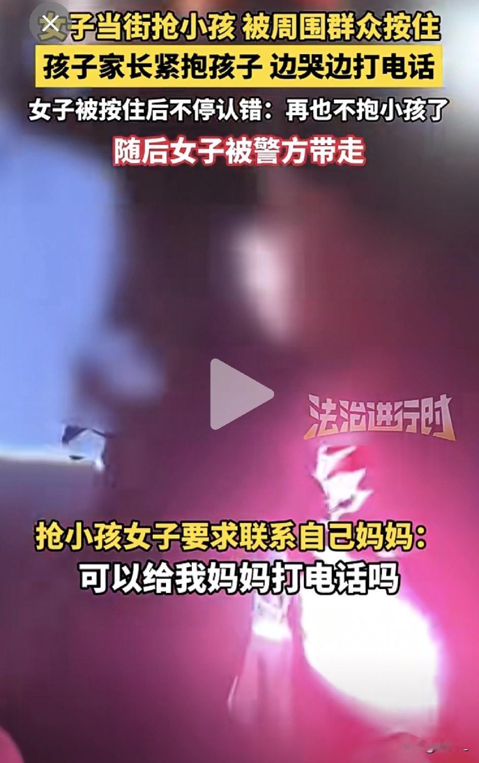 当街“抢娃”被按倒!陌生女子伸手去抱别人家小孩,路边众人一拥而上救下:“快报警!”最新回应来了! 2026年了,居然还有人当街“抢孩子”? 1月13日晚,湖南邵阳街头就上演惊魂一幕——一名女子突然伸手去拽别人家孩子,吓得家长紧紧抱住孩子大喊! 周围路人瞬间行动,三两步冲上去,七手八脚把她按倒在地。 女子被制服后,嘴里反复念叨:“我错了,我错了,我再也不抱小孩了……” 围观众人七嘴八舌谴责她: “认错也没用!” “这是你的孩子吗?” “不管是谁的都不可以抢!” 孩子的家长紧紧抱着孩子,害怕得大哭不止。 警察火速赶到,女子大喊着要求给自己的妈妈打个电话。 最终警察把人带走了,可她的动机瞬间在网络上掀起了轩然大波: ❓是精神恍惚? ❓是家庭矛盾? ❓还是真有团伙在背后? 评论区里的网友吵翻了天: “这年头抢孩子都这么大胆了?” “必须查她手机、查关系网!不能简单当个案处理!” “不能让她给人打电话,也可能是让同伙跑路呢!” 有人心软: “一直要找妈妈,是不是自己也受过什么刺激?” 也有网友在帮忙解释: “请大家不要传谣言,情况不属实,这个红衣女子是个自闭症女孩,曾经在某医院康复中心做过康复。她应该没有恶意,只是不会分辩!” 官方的回应也很快来了—— 据1月14日晚的官方回应,女子当时伸手抚摸孩子并牵孩子的手,行为不妥,引发了孩子家长误会。 目前双方已经消除了误会,达成了和解,此次事件只是一起因行为不当引发的误会,并非网传的抢孩子恶性案件! 只是年关将近,这事也确实给所有家长敲了警钟:出门牵紧娃,别让小人儿离开视线! 谁也不知道,蹲在街角的是路人,还是“有心人”。 作为家长,我们要做的、能做的,只是看好孩子,平安过年! 素材来源:法治进行时,侵联删!