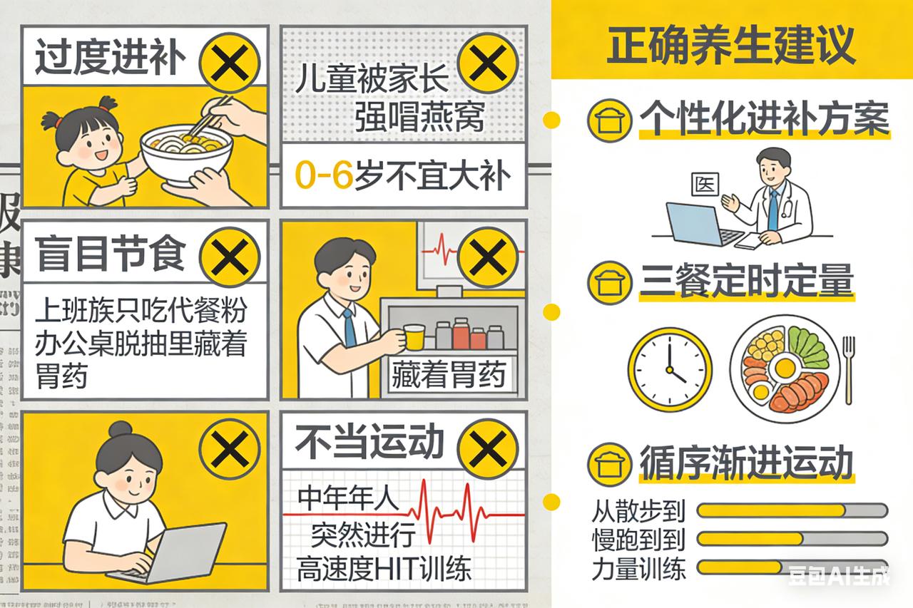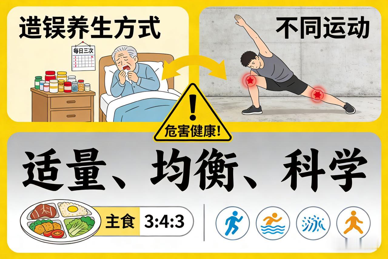 养生专家:这些常见养生方式可能危害健康 紧急叫停!这8件事你以为在养生,其实在“养病”!尤其第一个,害了太多人 在这个全民养生的时代,朋友圈的“土味养生经”往往比病毒更危险。以下这8个看似健康的习惯,实则是隐形杀手,尤其是第一个,正让无数中老年人付出健康代价。 1. 把维生素当糖吃:肝肾的“隐形炸弹” 这是最大的误区!许多人每天吃复合维生素片,认为能防癌抗衰。权威医学期刊《JAMA》研究证实:健康人群过量补充维C、维E,不仅不防癌,反而可能增加全因死亡率;长期大剂量服用更会导致药物性肝损伤,甚至引发急性肝衰竭。 2. 喝浓粥养胃:糖尿病的“升糖利器” 白粥熬煮后糊化彻底,血糖生成指数(GI)高达102(堪比葡萄糖)。胃病患者短期喝粥虽好,但长期会让胃功能“用进废退”。糖尿病患者喝粥,等同于喝糖水,餐后血糖瞬间飙升。 3. 日行万步:膝盖的“不可逆磨损” “步数排行榜”害了不少人。过量行走会加速膝关节软骨磨损,诱发滑膜炎。真正的养膝是“省着用”,而非“拼命用”,建议每日步数控制在6000步左右。 4. 油盐不进:电解质紊乱的元凶 为了防三高完全拒绝油盐,会导致钠摄入不足,引发低钠血症,出现乏力、恶心甚至昏迷。 5. 盲目“排毒”:肝肾的“过劳死” 乱吃排毒胶囊、断食疗法,会打断身体正常的代谢循环,严重时可导致肝肾功能衰竭。 6. 喝浓茶解酒:心血管的“双重打击” 浓茶中的茶碱利尿,会促使未分解的乙醛过早进入肾脏,同时兴奋心脏,加重酒后心悸风险。 7. 开水烫碗:食道的“慢性烫伤” 吃饭前用开水烫碗,温度和时间根本达不到杀菌标准,反而因高温刺激食道黏膜,增加食道癌风险。 8. 趁热吃:食道癌的“催化剂” 超过65℃的热食会烫伤食管黏膜,反复修复-损伤过程易诱发癌变。 养生没有标准答案,只有“因人而异”。切勿盲目跟风,身体不适请及时就医,别让“爱生”变成“害生”!