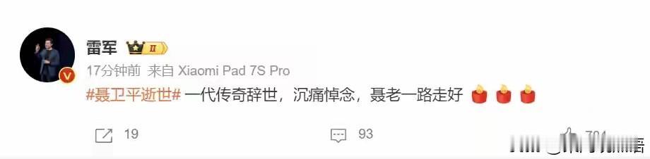 一代棋圣聂卫平去世 我猜到了九段柯洁肯定会发布悼念, 但没想到最近热搜不断的雷总,竟然也发布了悼念微博! 我记得我小时候第一次了解到围棋,就是看当时聂卫平的电视直播。虽然他一生没有拿过世界级别的冠军,但是他在围棋事业的贡献是不可忽视的。 如今忽然离开,柯洁发来悼念,雷军也发来悼念,因为他们都曾经受到棋圣——聂卫平的影响。雷总更是曾经一度痴迷于围棋,他的微博去年还发了一张自己年轻时看过的棋谱! 所以他的去世是一个领域中的一个时代的离去,不过我相信未来中国围棋会在他的影响下越走越好!