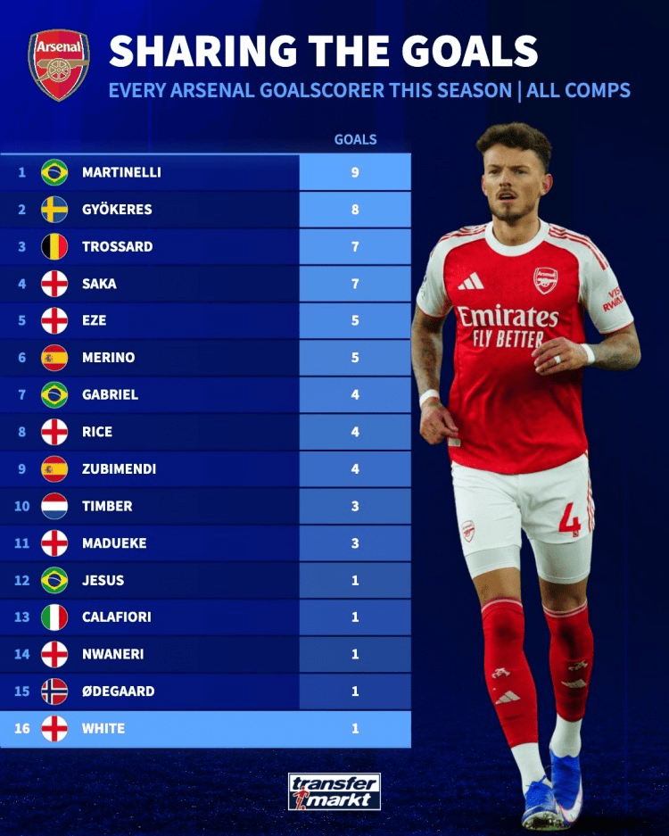 虎扑01月15日讯根据德国转会市场的统计,阿森纳队内本赛季目前已经有16名球员取得了进球,马丁内利是阵中的头号得分手。
