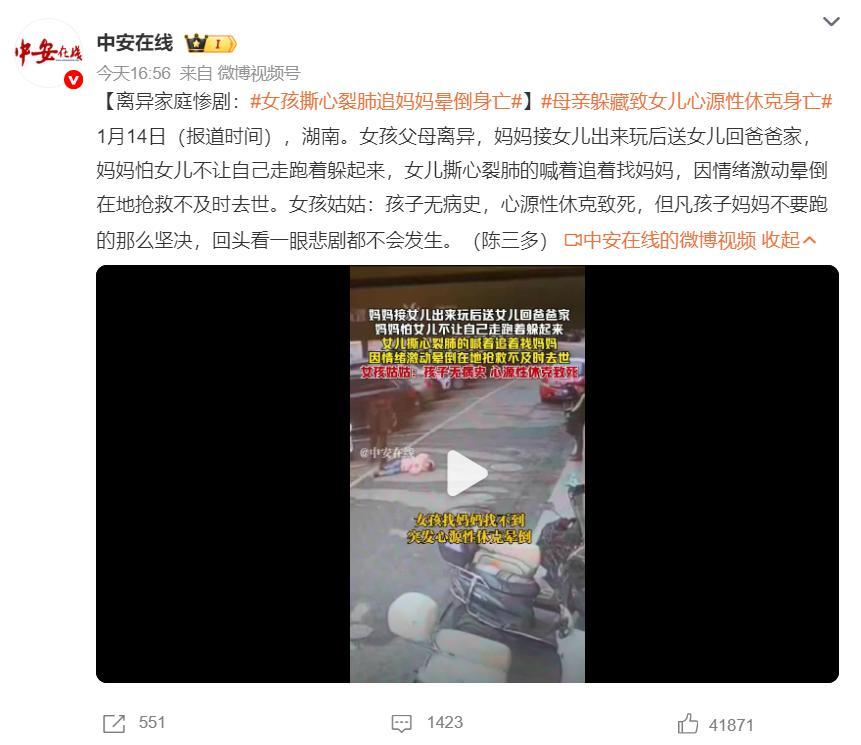 太揪心了!湖南,女孩父母离异,妈妈接女儿出去玩,送回的时候,她怕女儿不让她走躲起来,女儿撕心裂肺喊着追妈妈,结果因情绪激动晕倒在地,心源性休克,最后,女孩抢救不及时去世。(来源: 中安新闻) 1月14号报道的湖南一起未成年女孩的离世事件,让无数人揪心不已。 事情的起点,是一场再寻常不过的亲子探望,女孩的父母早已离异,她平时跟着父亲生活。 1月11日这天,母亲特意把女孩接了出来,带着她玩耍、买东西,度过了一段温馨的时光。 到了下午,母亲要把女孩送回父亲住处,可她心里犯了难,怕女儿舍不得自己,哭着不让走。 思来想去,母亲没敢跟女孩好好道别,而是选择了悄悄离开,甚至一路小跑着躲了起来,全程没敢回头。 由中安在线公布的超市门口的监控,清晰地记录下了接下来的一幕。 发现母亲不见后,女孩瞬间慌了神,开始在停车区域四处寻找,嘴里撕心裂肺地喊着,声音里满是恐惧和无助。 她没找到妈妈的身影,在原地徘徊了还不到一圈,突然双腿一软,直直地倒在了地上。 倒地后,女孩并没有安静下来,而是开始不断抽搐,看得出来,她正在承受着巨大的痛苦。 有路人注意到了这个孩子,一位老人慢慢走了过来,在女孩身边驻足看了几眼,没做任何停留就转身离开了。 马路对面,还有一名身穿黑衣的男子,也静静地看着眼前的这一幕,片刻后也转身回了屋。 没有人上前扶起女孩,也没有人拿出手机报警或呼叫救护车。 就这样,女孩没有在第一时间得到救援,尽管后来被紧急送医,但还是没有抢救回来。 女孩的姑姑悲痛地表示,孩子之前没有任何病史,最终是因为心源性休克去世的,而这一切,都源于情绪的剧烈激动。 姑姑的话里满是惋惜,她觉得,但凡孩子妈妈当时不要跑那么坚决,能回头看一眼,悲剧就不会发生。 事件曝光后,网上掀起了不小的讨论,很多人指责围观者太过冷漠,觉得他们的袖手旁观,错过了拯救女孩的最佳时机。 可仔细想想,这些围观者的行为,或许并不完全是冷漠。 在现实生活中,类似的场景很容易让人产生误判,一个孩子倒地哭闹抽搐,不少人第一反应可能会以为是孩子没得到满足,在躺在地上撒泼耍赖。 尤其是在没有家长在旁的情况下,很多人会犹豫,担心自己贸然上前,万一被后续赶来的家长误会成伤害孩子的人,反而说不清楚。 之前就有过蛋糕店老板好心帮忙,结果反被诬陷的案例,这样的事情多了,难免会让人在伸出援手时多几分顾虑。 除了这种误判和顾虑,离异家庭探望权的现实困境,也在这场悲剧里埋下了隐患。 民法典里明确规定,离婚后不直接抚养子女的父或母,有探望子女的权利,另一方有协助的义务。 可实际情况是,多数时候不直接抚养孩子的一方,每月只能获得一次探望机会,能做到每周探望一次的少之又少。 就像这起事件里的母亲,或许正是因为和女儿相处的时间太少,才既想好好陪伴,又怕离别时的纠缠,最终选择了最草率的躲避方式。 而从母亲的角度来说,她大概率也没想到,自己的一个躲避行为,会酿成如此严重的后果。 或许她当时只觉得,孩子哭一会儿就好了,根本没意识到,女孩的倒地抽搐不是撒泼,而是生命在流逝的信号。 作为母亲,她对孩子本就有法定的救助义务,可在最关键的时刻,她却因为躲着没发现,错过了最后的救援机会,未来可能还要承担相应的法律责任。 这场悲剧的发生,从来都不是某一个人的单一过错,而是多种因素层层叠加的结果。 是母亲离别时的草率选择,是路人对场景的误判和救助顾虑,也是离异家庭亲子相处模式里的现实困境。 我们没必要急于对任何人进行道德审判,更该做的,是从这场悲剧里吸取教训。 对于离异家庭的父母来说,无论探望时间多紧张,离别时都该好好跟孩子沟通,给孩子足够的心理准备,而不是用躲避的方式逃避问题。 对于我们每个人而言,遇到类似的场景时,或许可以多一分谨慎和关注,哪怕只是打个报警电话,可能就能挽救一条生命。 毕竟,每个孩子的生命都值得被珍视,每一次可能的救援机会,都不该被轻易错过。