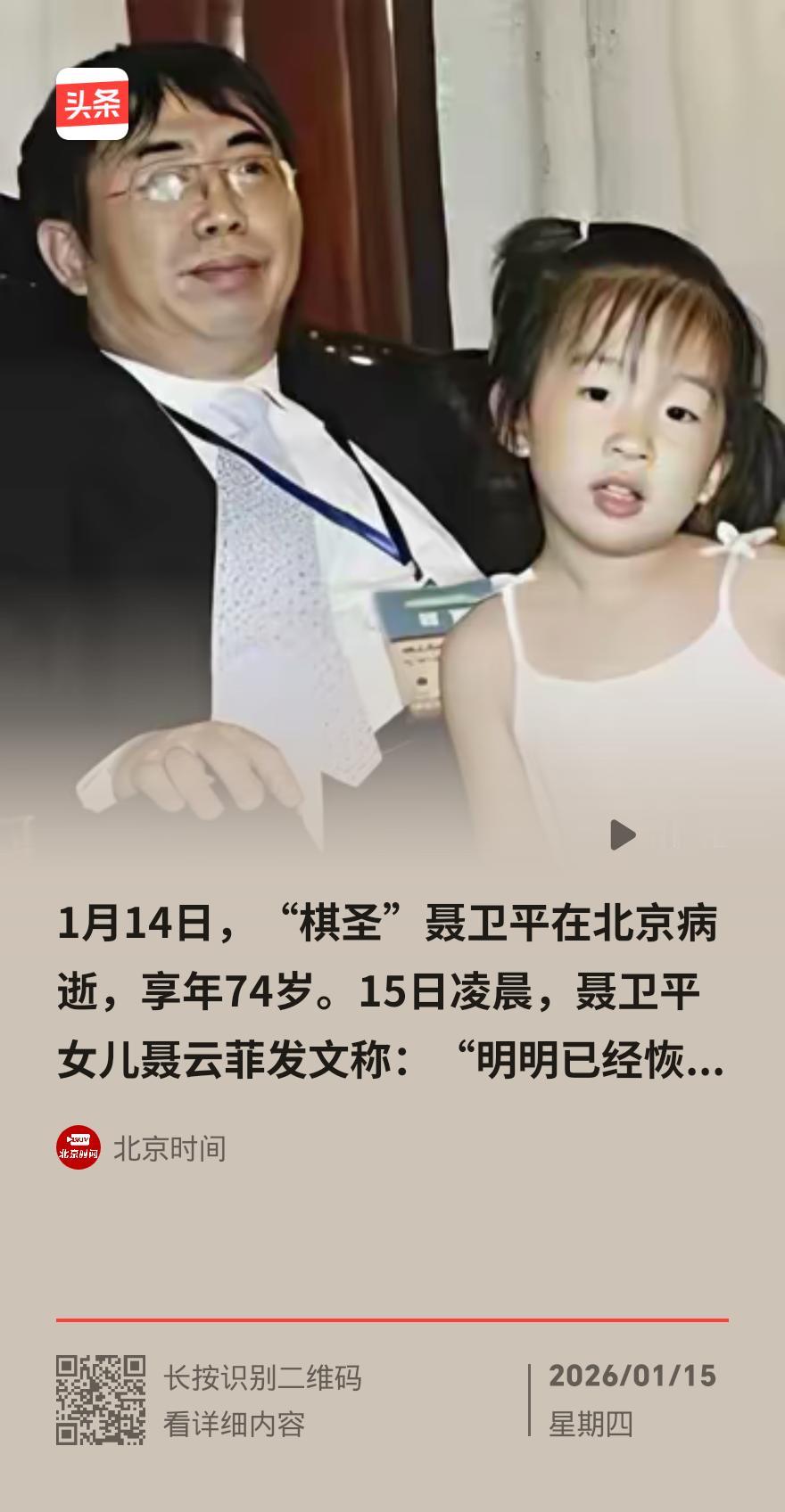 74岁“棋圣”聂卫平病逝,女儿凌晨泣诉无常,两度抗病奇迹终难敌岁月 1月14日晚,中国围棋协会名誉主席、“棋圣”聂卫平九段在北京病逝,享年74岁。一代棋坛传奇落幕,女儿聂云菲凌晨发文悼念,字里行间满是痛惜与不舍。 “明明恢复得那么好,为何上天如此无情”,聂云菲的文字如重锤敲在人心上,社交账号签名已改为“老爸,我好想你”,简单六字道尽父女情深。这位在黑白棋盘上叱咤风云的老者,生命里曾两场硬仗打得惊心动魄。 2013年查出癌症,聂卫平凭钢铁意志闯过手术关,奇迹般重返热爱的围棋界;2025年突发脑梗昏迷12天,他再度从死神手中挣脱,积极康复的模样让亲友燃起希望。两度与病魔掰手腕的他,终究没能抵过岁月侵蚀。 棋盘上的聂卫平,是中日擂台赛11连胜的传奇,是点亮中国围棋的灯塔,“棋圣”称号早已刻进一代人的记忆。生活中的他,是女儿牵挂的父亲,是棋迷心中的标杆,即便历经病痛,也始终保持着对生活的热忱。 生命如棋局,落子终有定。聂卫平用一生书写围棋传奇,也用坚韧诠释生命力量。女儿“子欲养而亲不待”的遗憾,戳中无数人内心最软的角落。你心中的聂卫平,是赛场传奇还是温情老者?姚卫平 象棋宗师聂卫平