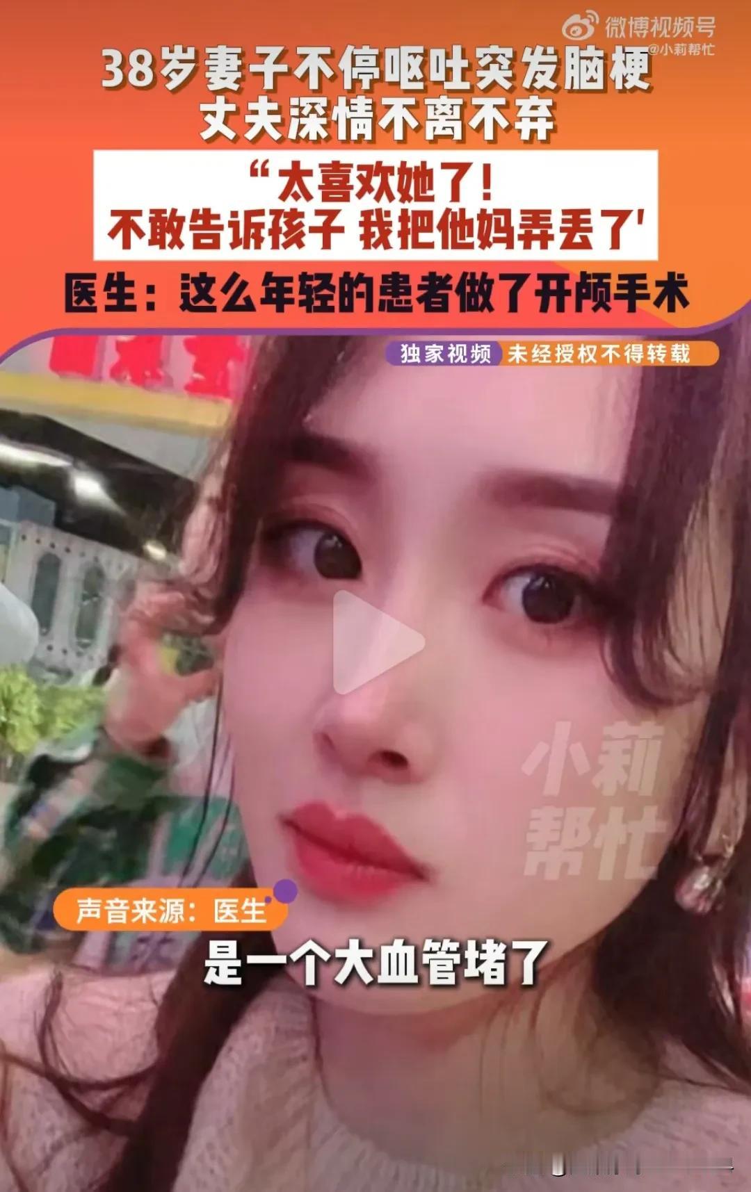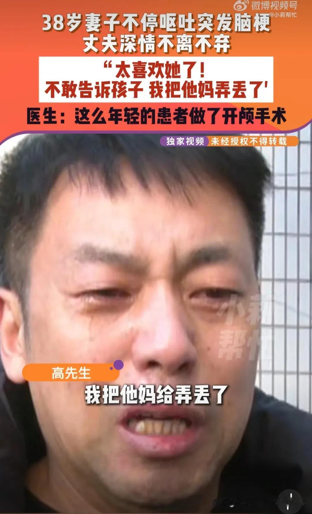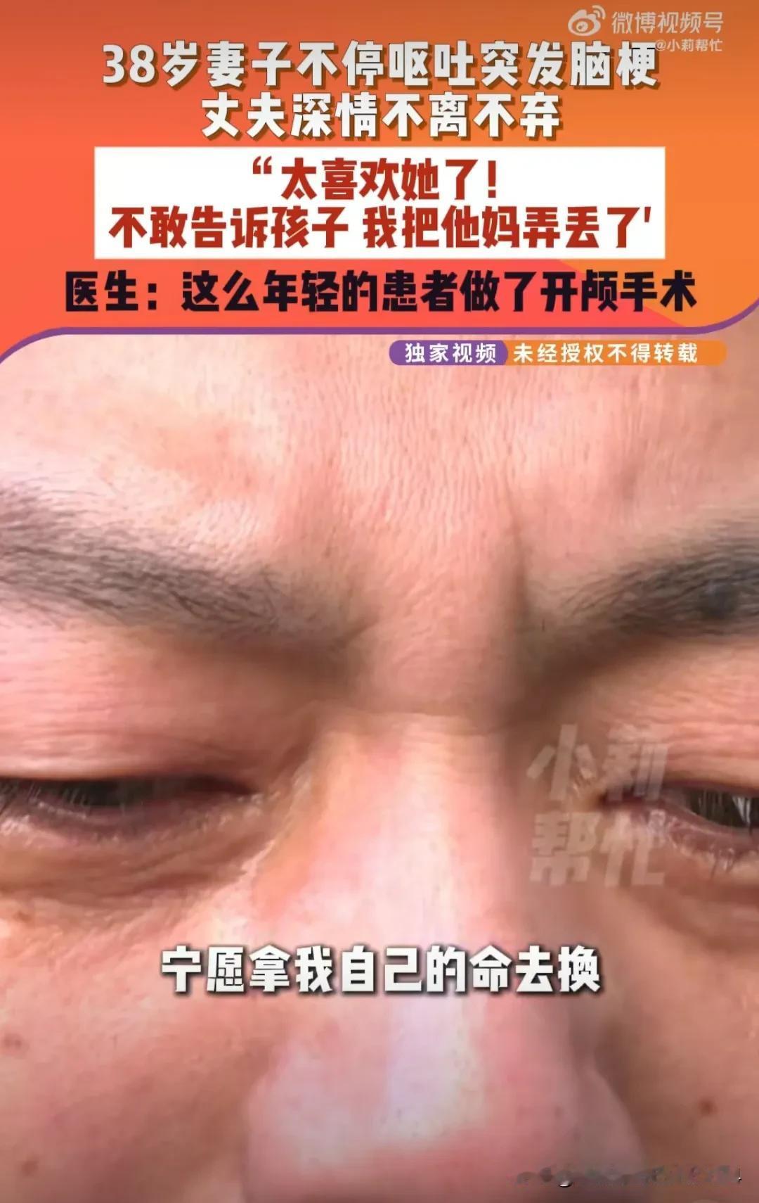“太喜欢她了!不敢告诉孩子,我把他妈弄丢了[流泪]” 河南洛阳,一名中年男子哭得,眼泪鼻涕混着往下流,多次哽咽到不能自已,却断断续续冒出这么几句话。 男子老婆才38岁,很是漂亮,日常勤俭持家、照顾孩子样样在行。 谁知却在一个夜里出现持续性呕吐,次日便意识不清!送医后被诊断出,颅内有根大血管堵塞,导致了大面积脑梗死,必须紧急开颅做手术。 可术后22天,老婆仍住在重症监护室。虽恢复意识但存在失语、单侧肢体瘫痪后遗症。 男子急得不行,痛哭流涕自责结婚19年“连洛阳都没带出去过”,还表示“哪怕以后要一口一口喂饭,也绝不离开她” 没有太多华丽虚伪的语言,只有一句句发自内心的承诺:以前是你辛苦照料着全家,以后余生就换我来照顾你。 网友: “好可惜啊,这么年轻漂亮的女子,竟然得了脑梗” “好男人只在视频里,从不会出现在我的眼前”