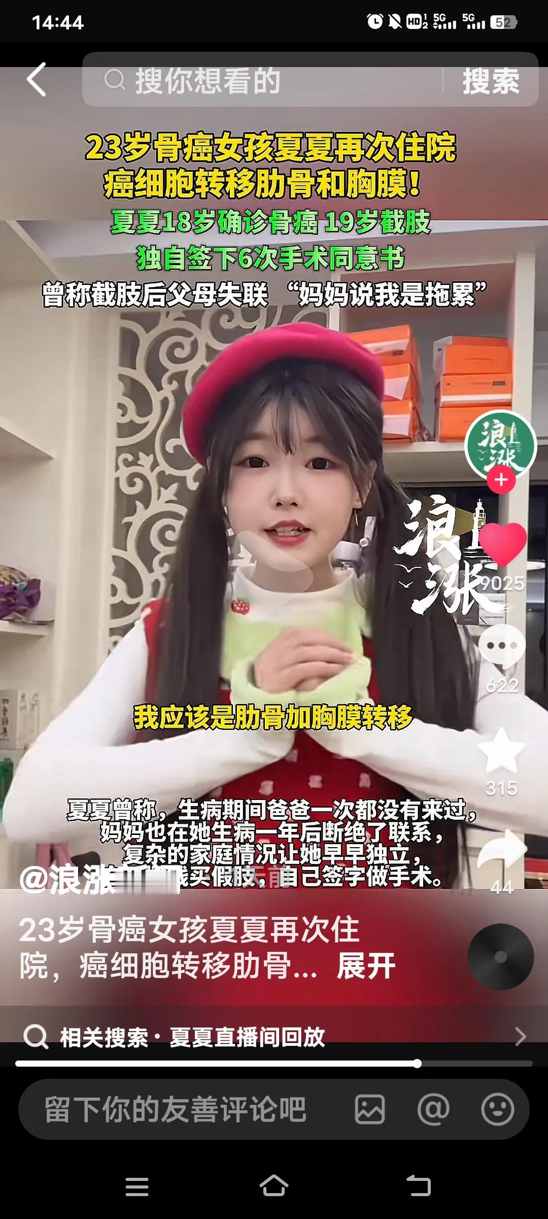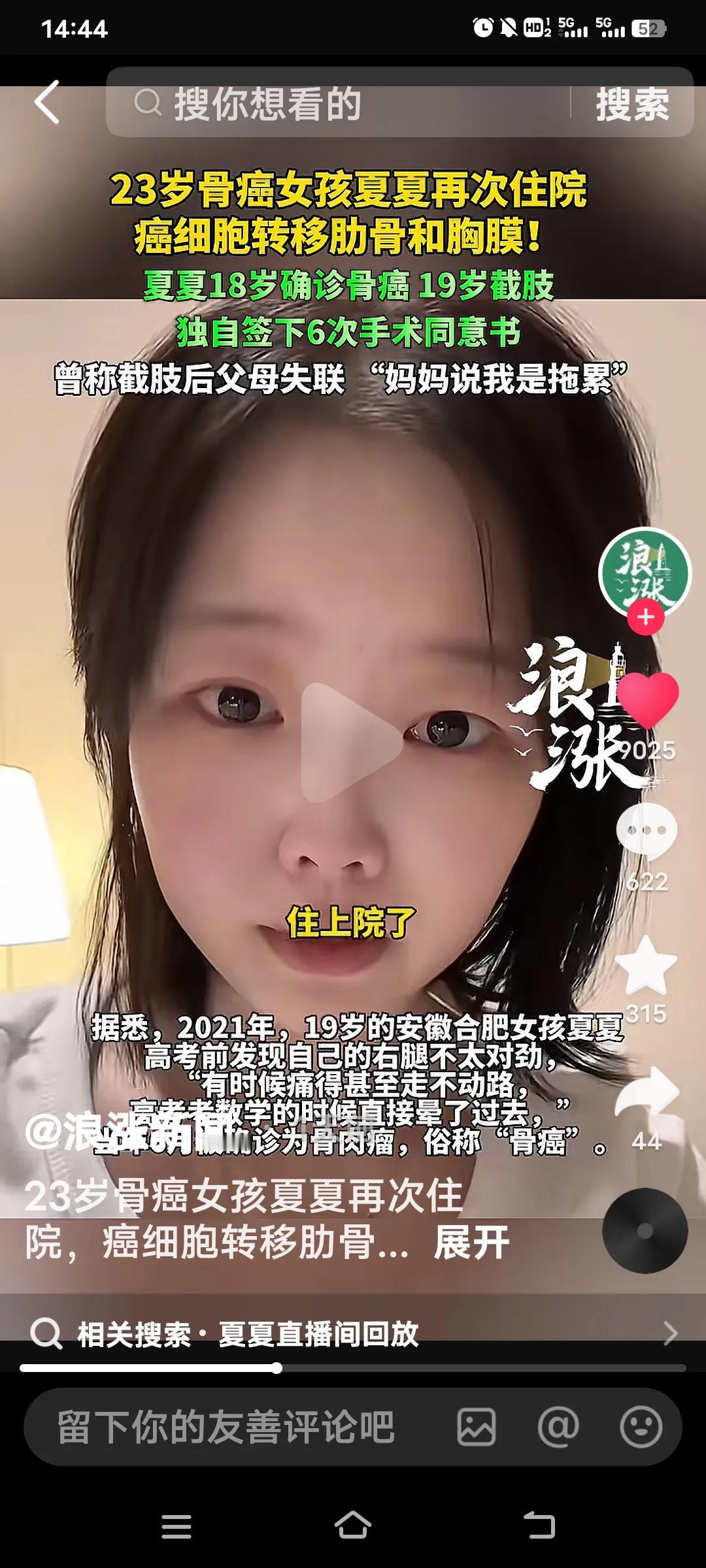真是个坚强的女孩啊!23岁的骨癌女孩再度住院了。 18岁时,安徽合肥女孩夏夏在高考前发觉自己右腿有些异样,经检查确诊为骨癌,19岁右腿被截肢。此后,父亲离她而去,一年后母亲也消失不见,还称她是拖累。但她并未放弃生命的意义,自己签字做了6次手术,自述经历了23次化疗,还考上了师范大学。 此次她来到上海住院,她说遇到了好心人,司机等人帮她推轮椅。由于病情恶化,癌细胞已转移到肋骨和胸膜,她希望大家能祝愿她这位小公主好运。 看到这里,我不禁泪流满面。她的病情引得众多人关注,可亲生父母为何能如此狠心,相继离她而去?难道人心不是肉长的吗?怎会如此忍心!在此,我祝愿夏夏百病全消,永远健康快乐地生活! 患癌症女孩 女孩患骨癌 安徽患骨癌女孩