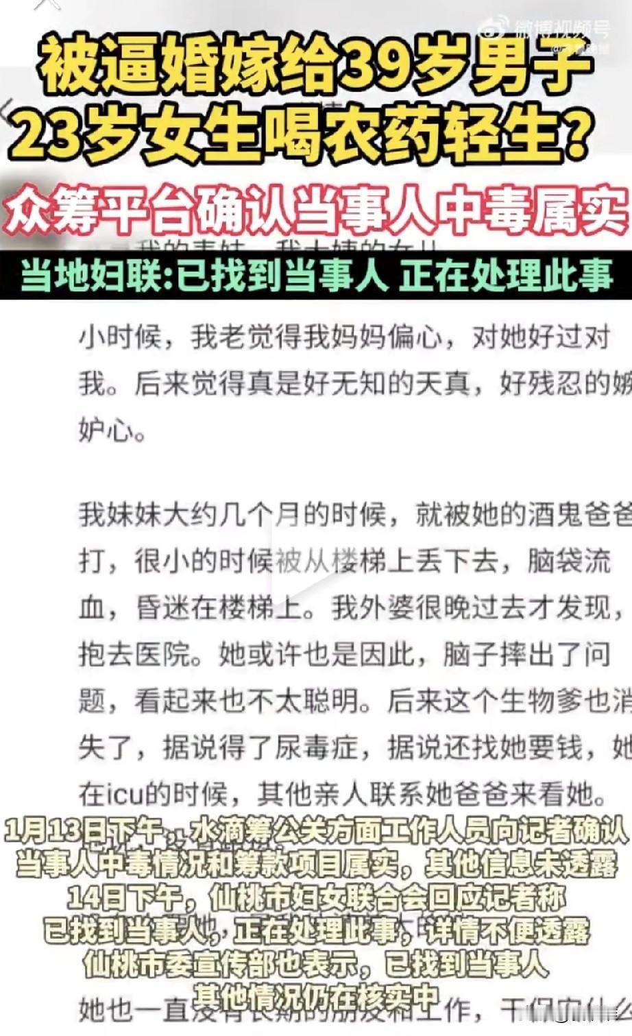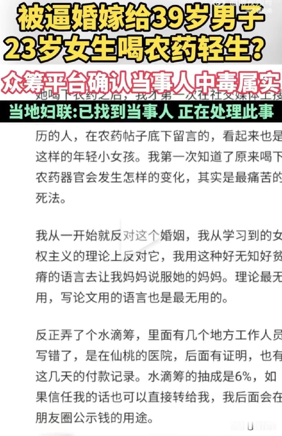 太荒唐了,怎么现在还有逼迫婚姻的事,23岁女子被父母逼迫嫁给39岁男子,女孩无奈只能喝农药抗议,家属因为无力承担女孩的医药费在众筹平台上发起了捐款,现在已经花去了20多万,但是病情还在加重。真不知道这女孩父母在想什么,还能做出这样的事,我觉得无非就是为了男方的钱财。真是悲哀啊!