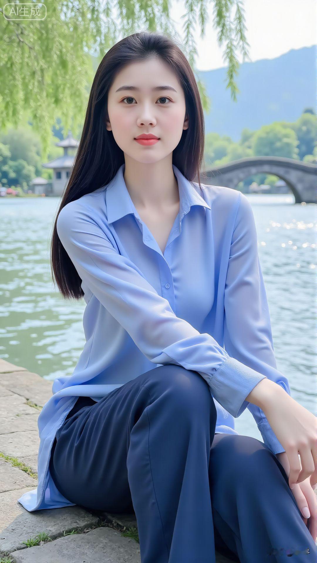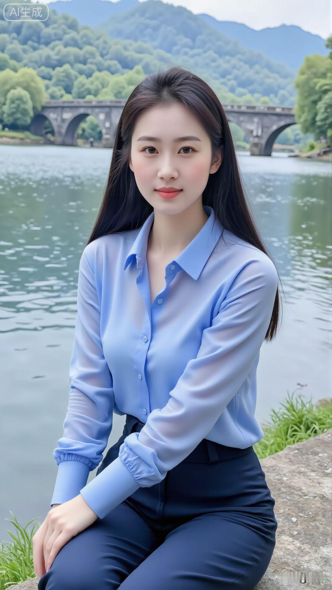 水边人影静,风中发丝轻。