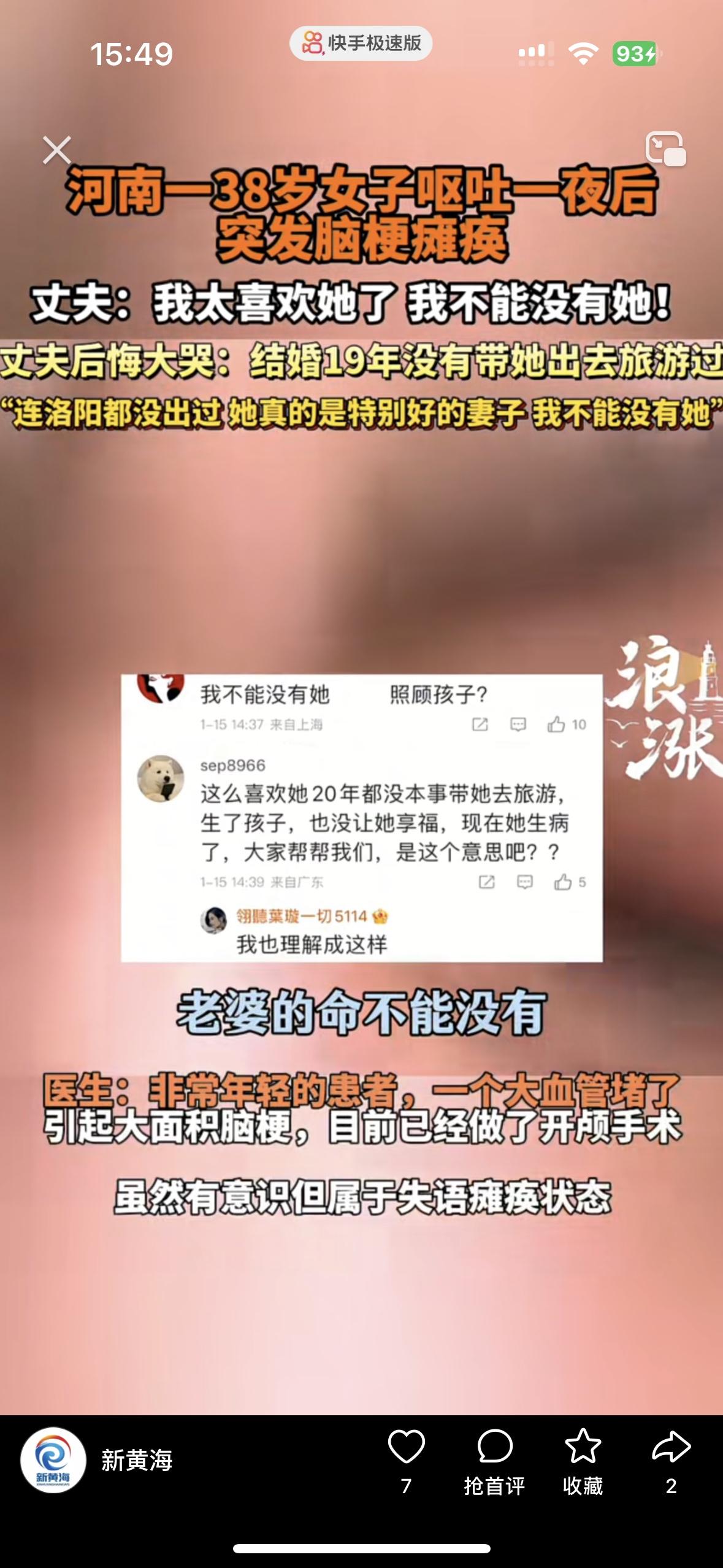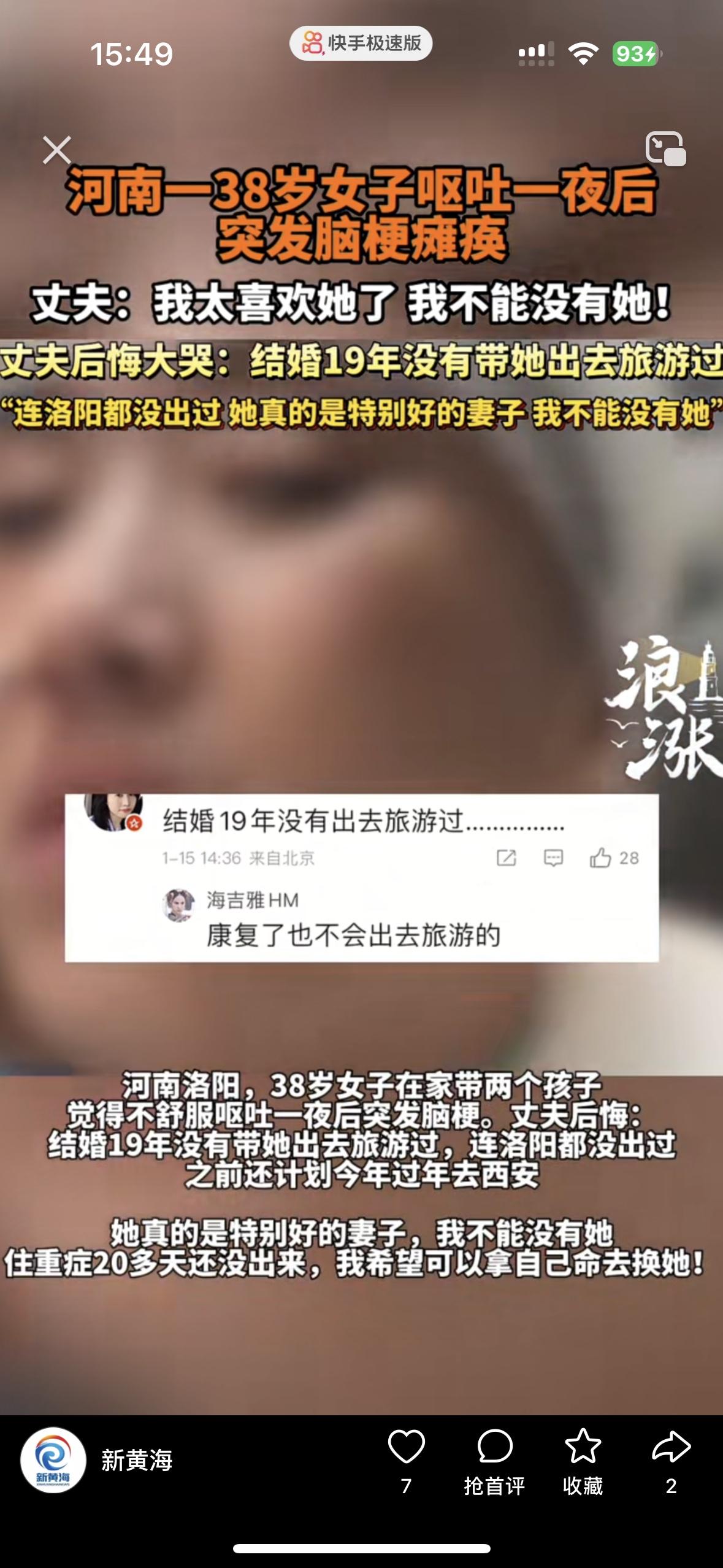 现在知道后悔了!早干嘛去了,结婚19年了,居然一次都没带妻子旅游过 河南38岁女子在呕吐一宿后,突发脑梗,脑血管的一个大血管堵住了引起脑部大面积脑梗,虽然及时送往医院做了开颅手术,但仍然处于失语瘫痪状态。 丈夫痛哭说:我太喜欢她了,不敢想没了她该怎么活?结婚19年,19岁就跟他结婚,生了2个孩子,居然一次都没出去旅游过?甚至都没出过洛阳,如今妻子病了,才猛然惊醒自己亏欠了她的太多。