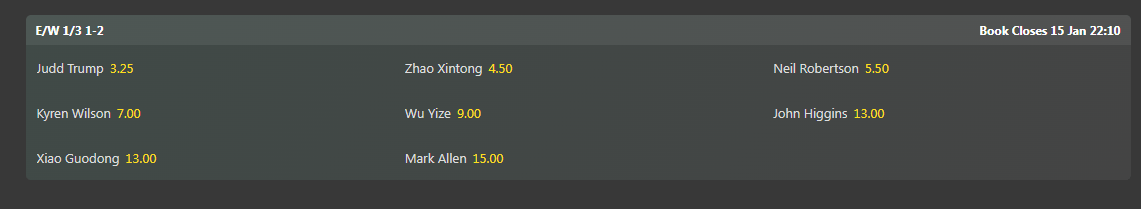 相关机构更新夺冠赔率,特鲁姆普以1赔3.25领跑,赵心童1赔4.50排名第二。