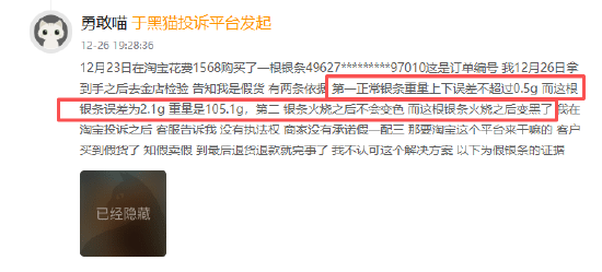 12月以来银价飙升,大量消费者选择购入实物银条进行投资,有多位消费者向黑猫投诉平台反馈,自己在淘宝购买的银条出现了拖延发货及售假等情况,有消费者发现购入的投资银条重量异常,使用火烧等方法鉴定后发现并非纯银,还有消费者表示自己通过第三方检测发现购入的银条实际为银包铅,去找商家进行售后时发现商家早已关店跑路,针对上述纠纷,淘宝平台客服也未能给出有效处理方案。