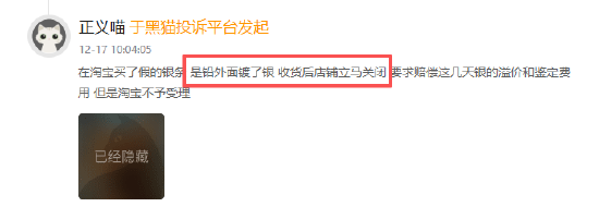 12月黑猫投诉综合电商领域红黑榜:淘宝店铺出售假银条拖延发货,平台客服消极处理