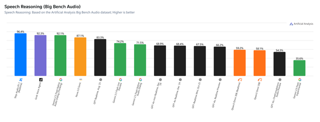 据了解,该榜单是目前业界评估“原生语音模型”(NativeAudioModels)最权威的第三方基准之一。核心考量模型直接处理音频并进行复杂逻辑推理的能力,主要考察维度包括准确率、首包延迟等。