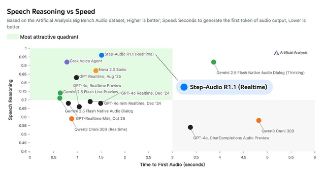 根据榜单评测,在性能与速度的综合权衡上,Step-Audio-R1.1全面碾压同类语音模型。