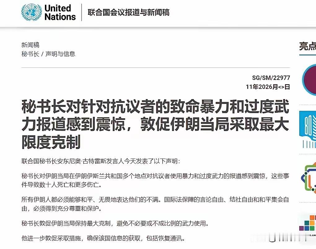 近年来发现联合国秘书长变味了,有点欺软怕硬,缺乏客观、公正! 近日,联合国秘书长就通过发言人对伊朗控制“抗议者”发表声明称,秘书长对针对抗议者的致命暴力和过度武力报道感到震惊,还敦促伊朗克制,更称伊朗人必须和平无畏地表达不满,要保障什么言论自由之类的。 然而,在美国对委内瑞拉军事行动时,联合国秘书长不谴责、不能阻止,怪不得中国记者提问时说道,这样的联合国到底还有什么现实意义呢? 其实,联合国本身要扮演的角色应该是锄强扶弱,现实中却只对弱者讲规则,对强者却无能为力的选择了忽视,这必须反思改善。