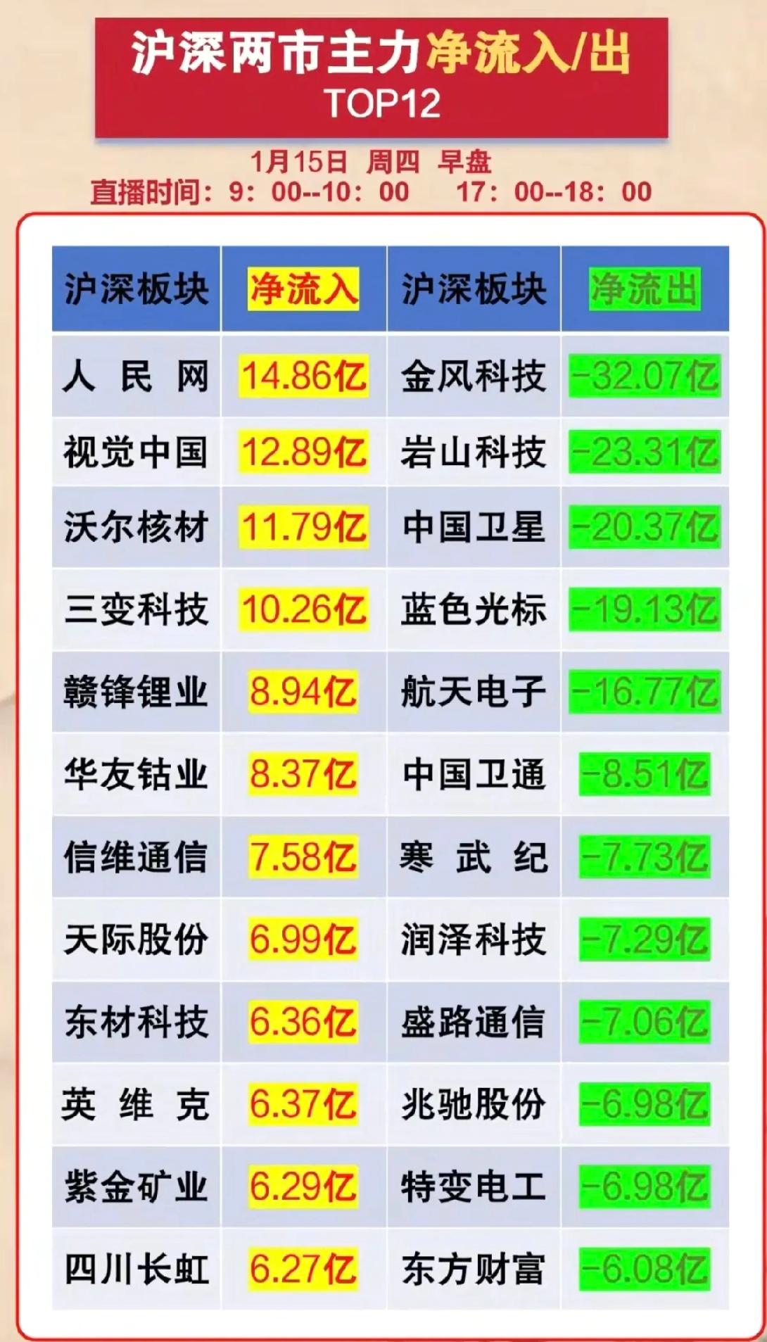 1月15日,周四早盘A股人气排行榜!!! 华胜天成,昨日大柚子抢筹,AI智能体板块,后市值得高看一眼;视觉中国主力资金大幅流入12.89亿,后市值得期待;赣锋锂业主力资金净流入8.94亿,后市值得重点关注;金风科技主力净流出超32亿,后市需小心谨慎!!!