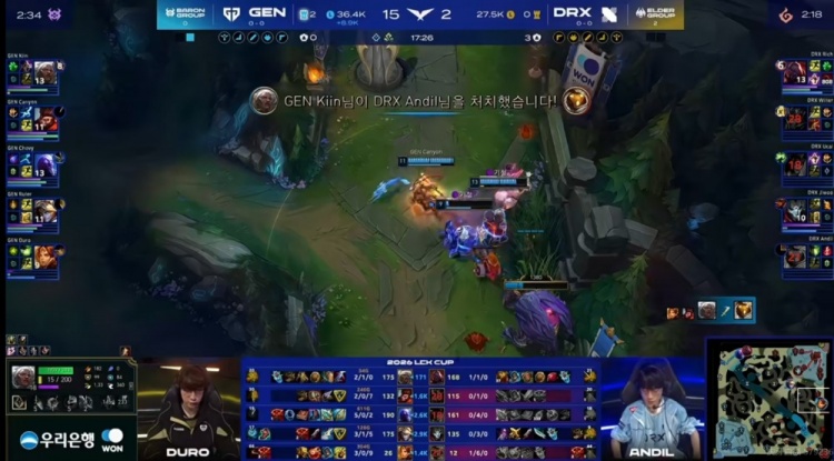 第21分钟Canyon猴子用命开团,GEN双C收割战局团灭DRX,随后Kiin安蓓萨带队上路出击再打一波0换4,GEN回头收下大龙,15000经济差了!随后高地团四件套的Ruler伊泽瑞尔站桩输出,17杀落袋结束比赛!GEN碾压击败DRX!