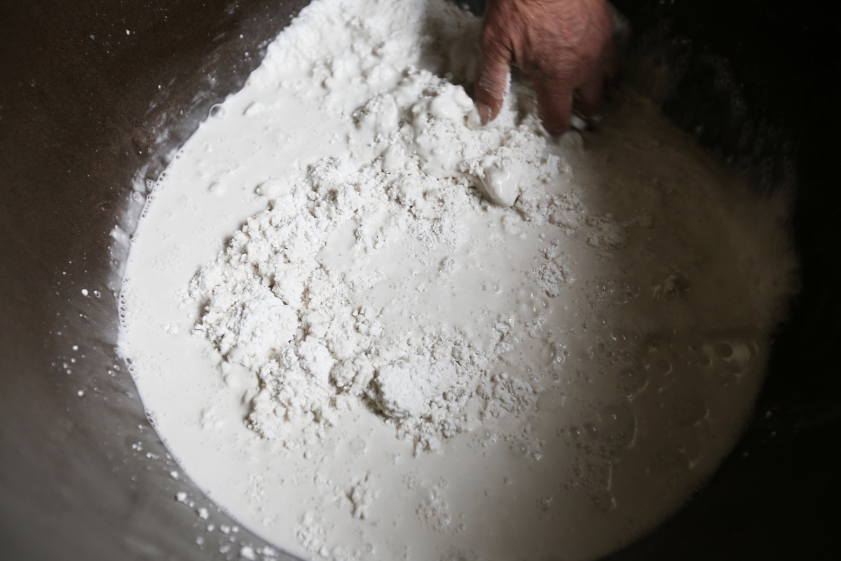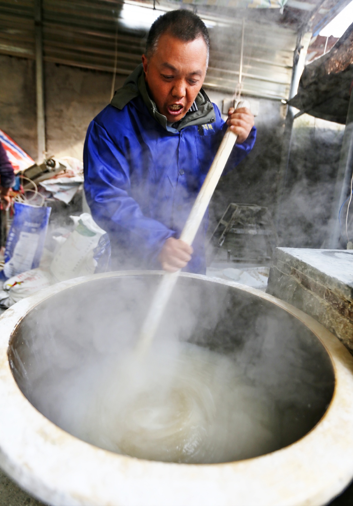 “第一步就是打芡头,就像做馒头不能缺少酵母一样,没有芡头就没法做粉条。”王鹏飞说,经验丰富的师傅,仅靠目测就能精准把握温水和淀粉的比例。