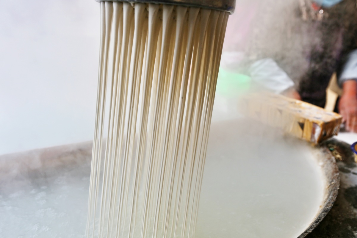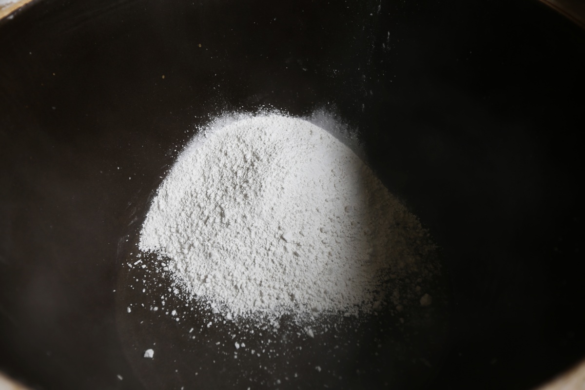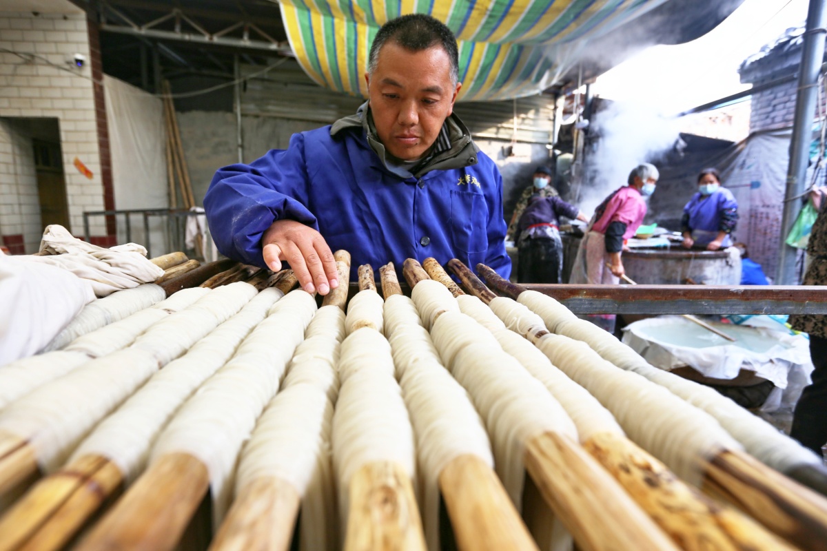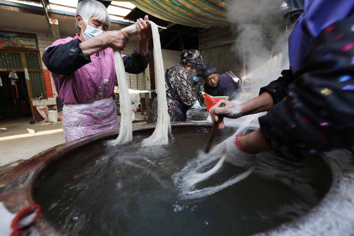 在当地的一家手工作坊,记者看到提前研磨好的红薯淀粉,像雪白的面粉一样。一口大锅支在火灶上,王鹏飞和另一位师傅老杨正在查看火候、手测水温,等待下粉条。
