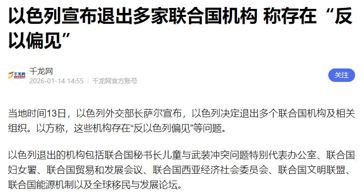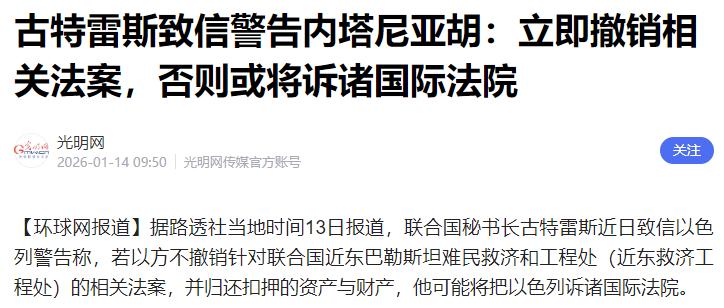 以色列计划大规模“退群”,古特雷斯罕见警告:不归还联合国资产,就诉诸国际法院   当地时间1月13日,以色列外交部长萨尔突然抛出重磅消息,宣布该国将正式退出联合国妇女署、联合国文明联盟等多个联合国下属机构。在以方给出的理由里,这些机构都存在所谓的“反以问题”,言下之意,退出不过是对这种“不公”的回应。   以方还特意强调,这次“退群”绝非终点,未来还会继续对所有联合国机构展开全面审查,不排除进一步退出更多机构的可能。这番表态尽显强硬姿态,毫无妥协余地,就是这颠倒黑白的厚脸皮也确实难以被学走。   而就在同一天,联合国秘书长古特雷斯已经正式致信以色列总理内塔尼亚胡,发出了措辞严厉的警告。信中明确要求,以色列必须立即撤销针对联合国近东巴勒斯坦难民救济和工程处(简称近东救济工程处)的相关法案,同时归还此前被以方查封扣押的该机构资产。   古特雷斯在信中直言,以色列的这些行为已经直接违反了国际法义务,必须马上纠正。如果以方拒不执行,联合国将毫不犹豫地把以色列起诉至国际法院,用法律手段维护自身权益。   古特雷斯向来以温和稳健的外交风格著称,此次如此直白地亮出“诉诸国际法院”的底牌,实属罕见,足见联合国对这一问题的重视和愤怒。而要搞清楚这场冲突的来龙去脉,就不能不提到近东救济工程处。   联合国近东救济工程处成立于1949年的机构,长期以来一直为约旦河西岸、加沙地带以及周边国家的巴勒斯坦难民提供教育、医疗和基本生活救助,是当地人道主义救援的重要支柱。   但以色列对该机构的不满早已根深蒂固,去年10月,以色列议会通过法案,禁止近东救济工程处在以色列控制的地区开展活动,还断绝了双方的官方接触。   今年1月,以方更是变本加厉,修订法案授权切断该机构设施的水电供应,随后又直接查封了其位于东耶路撒冷的办事处,扣押了办公设备等大量资产,甚至强行降下联合国旗帜、升起以色列国旗,一系列举动可谓步步紧逼,让近东救济工程处的救援工作举步维艰。   以色列此次大规模“退群”,看似是对“反以偏见”的反抗,实则背后另有考量。有专家分析,以方选择退出的这些机构,大多是咨询性或倡议性组织,不具备安理会那样的强制力,退出成本相对较低。   通过这种方式,以色列既能向国内民族主义选民示好,巩固右翼政府的支持率,又能向联合国施压,试图迫使相关机构软化对其的批评态度,同时还能呼应美国近期的“退群”策略,巩固美以同盟关系。   但这种单边主义行径,无疑会让以色列付出沉重代价,不仅会进一步萎缩其国际话语权,损害道义信誉,还会失去联合国机构提供的技术合作、反恐情报等实际利益。   以色列的做法也早已引发国际社会的广泛不满。1月5日,西班牙、爱尔兰等欧洲七国发表联合声明,谴责以方举动削弱联合国使命、违反国际法,可能造成严重人道主义后果。   此前,埃及、沙特等中东八国也联合发声,敦促以色列保障救援工作畅通无阻。如今古特雷斯的警告,更是把双方的矛盾摆到了台面上,让以色列陷入了不小的国际舆论压力之中。   当前,加沙地带的人道主义危机本就十分严峻,近东救济工程处的正常运转直接关系到无数难民的基本生存。以色列的“退群”威胁和对救援机构的打压,无疑会让局势雪上加霜。   而这场博弈的后续发展,不仅关乎巴以双方的利益,更会影响全球多边主义秩序的稳定。