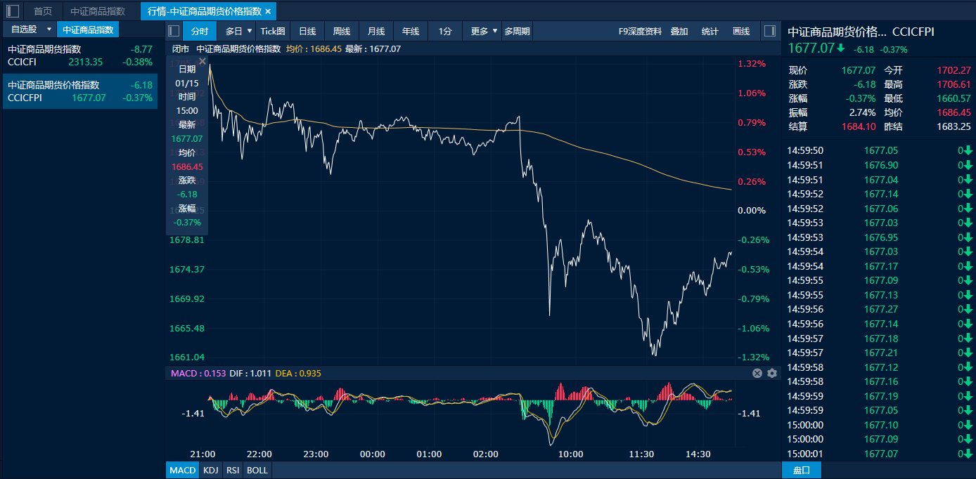 截至15日下午收盘,中证商品期货价格指数收报1677.07点,较前一交易日下跌6.18点,跌幅0.37%;中证商品期货指数收报2313.35点,较前一交易日下跌8.77点,跌幅0.38%。