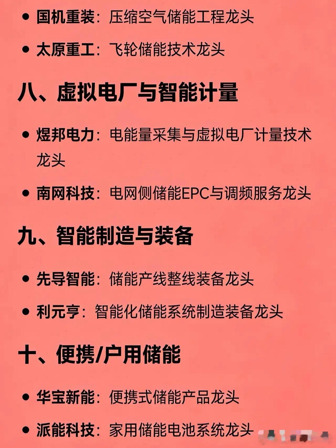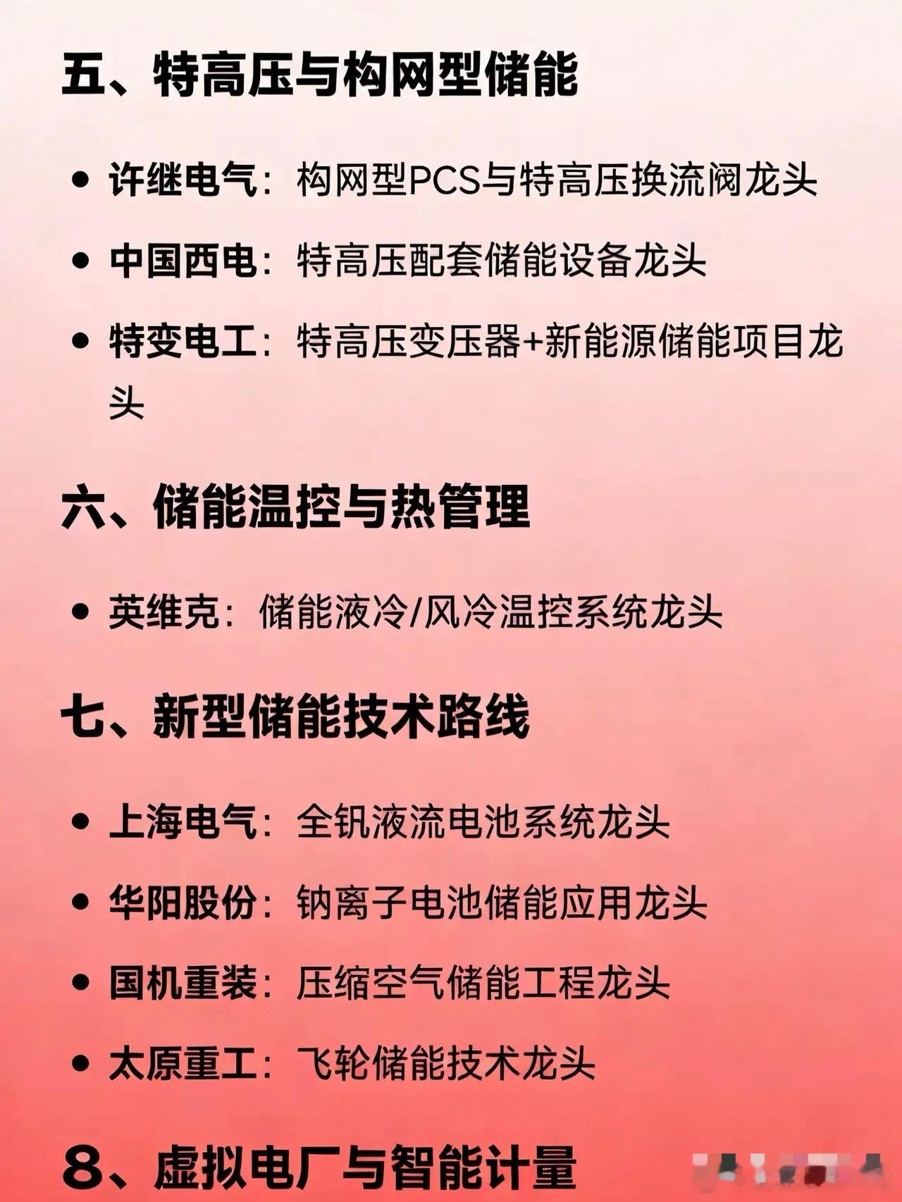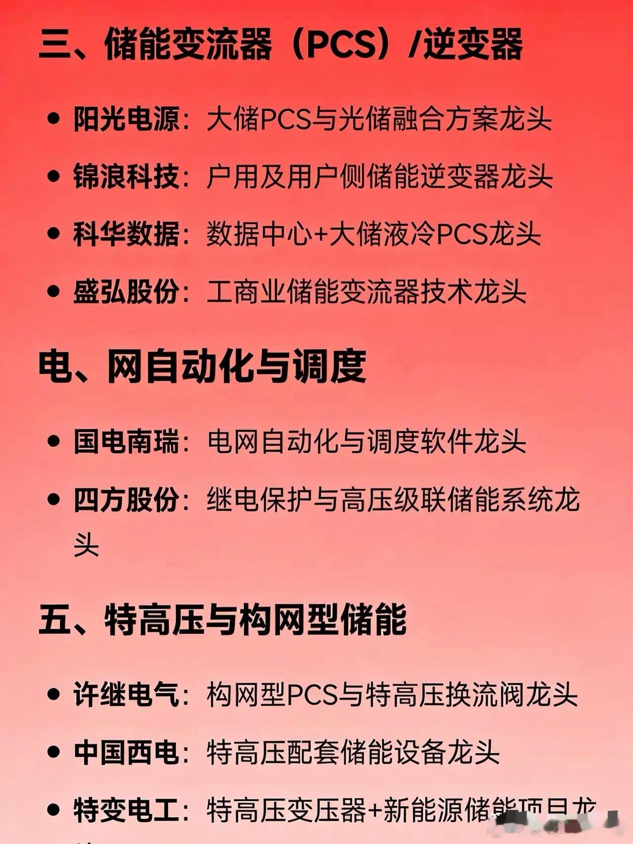 储能+智能电网概念细分龙头企业汇总一、储能系统集成阳光电源:全球储能系统集成龙头比亚迪:电网级储能系统龙头阿特斯:光储一体化项目龙头二、储能电芯(电池)宁德时代:全球储能电芯出货量龙头亿纬锂能:大容量储能电芯主要供应商三、储能变流器(PCS)/逆变器阳光电源:大储PCS与光储融合方案龙头锦浪科技:户用及用户侧储能逆变器龙头科华数据:数据中心+大储液冷PCS龙头盛弘股份:工商业储能变流器技术龙头四、电网自动化与调度国电南瑞:电网自动化与调度软件龙头四方股份:继电保护与高压级联储能系统龙头五、特高压与构网型储能许继电气:构网型PCS与特高压换流阀龙头中国西电:特高压配套储能设备龙头特变电工:特高压变压器+新能源储能项目龙头六、储能温控与热管理英维克:储能液冷/风冷温控系统龙头七、新型储能技术路线上海电气:全钒液流电池系统龙头华阳股份:钠离子电池储能应用龙头国机重装:压缩空气储能工程龙头太原重工:飞轮储能技术龙头八、虚拟电厂与智能计量煜邦电力:电能量采集与虚拟电厂计量技术龙头南网科技:电网侧储能EPC与调频服务龙头九、智能制造与装备先导智能:储能产线整线装备龙头利元亨:智能化储能系统制造装备龙头十、便携/户用储能华宝新能:便携式储能产品龙头派能科技:家用储能电池系统龙头