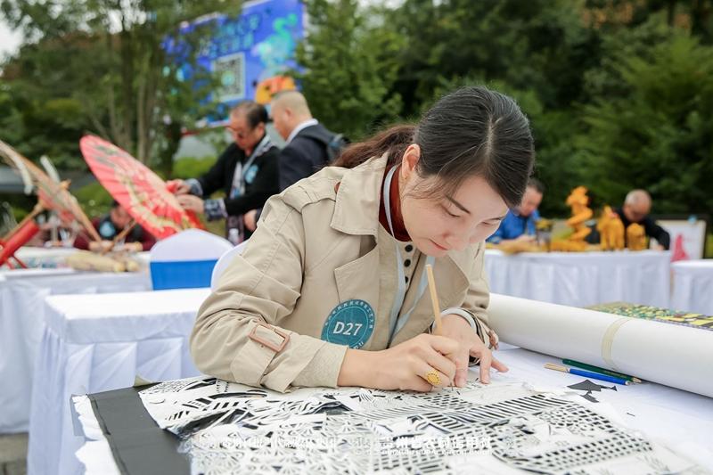 江露莎在活动现场精细勾勒剪纸纹样。习水县融媒体中心供图
