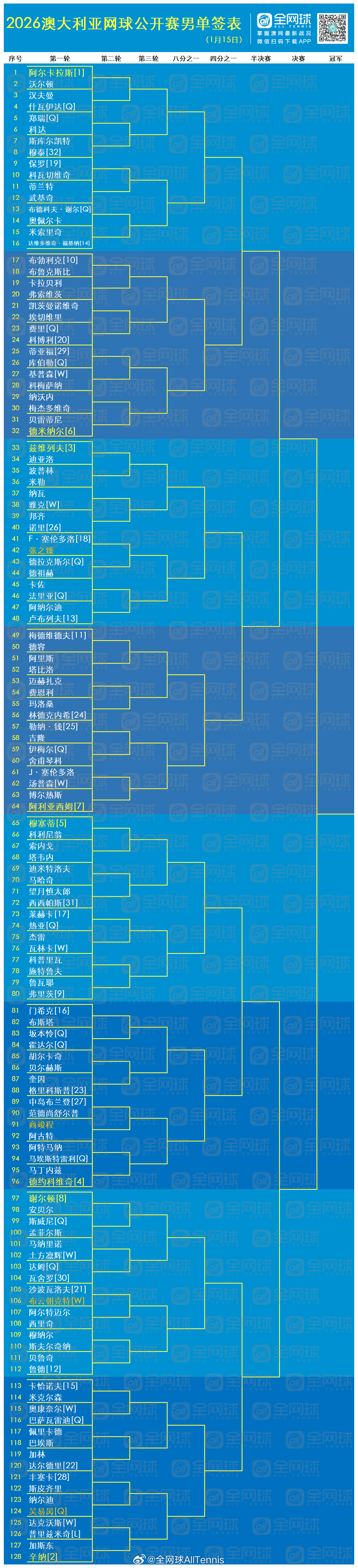 澳网2026 男单女单正赛签表完整版📩资格赛选手全部落位。中国球员正赛首轮对阵男单:张之臻🇨🇳 vs 塞伦多洛🇦🇷商竣程🇨🇳 vs 阿古特🇪🇸吴易昺🇨🇳 vs 纳尔迪🇮🇹布云朝克特🇨🇳 vs 沙波瓦洛夫🇨🇦女单:王欣瑜🇨🇳 vs 卡列尼娜🇺🇦张帅🇨🇳 vs 普雷斯顿🇦🇺袁悦🇨🇳 vs 斯瓦泰克🇵🇱白卓璇🇨🇳 vs 帕芙柳琴科娃🇷🇺这很澳网体育大赏