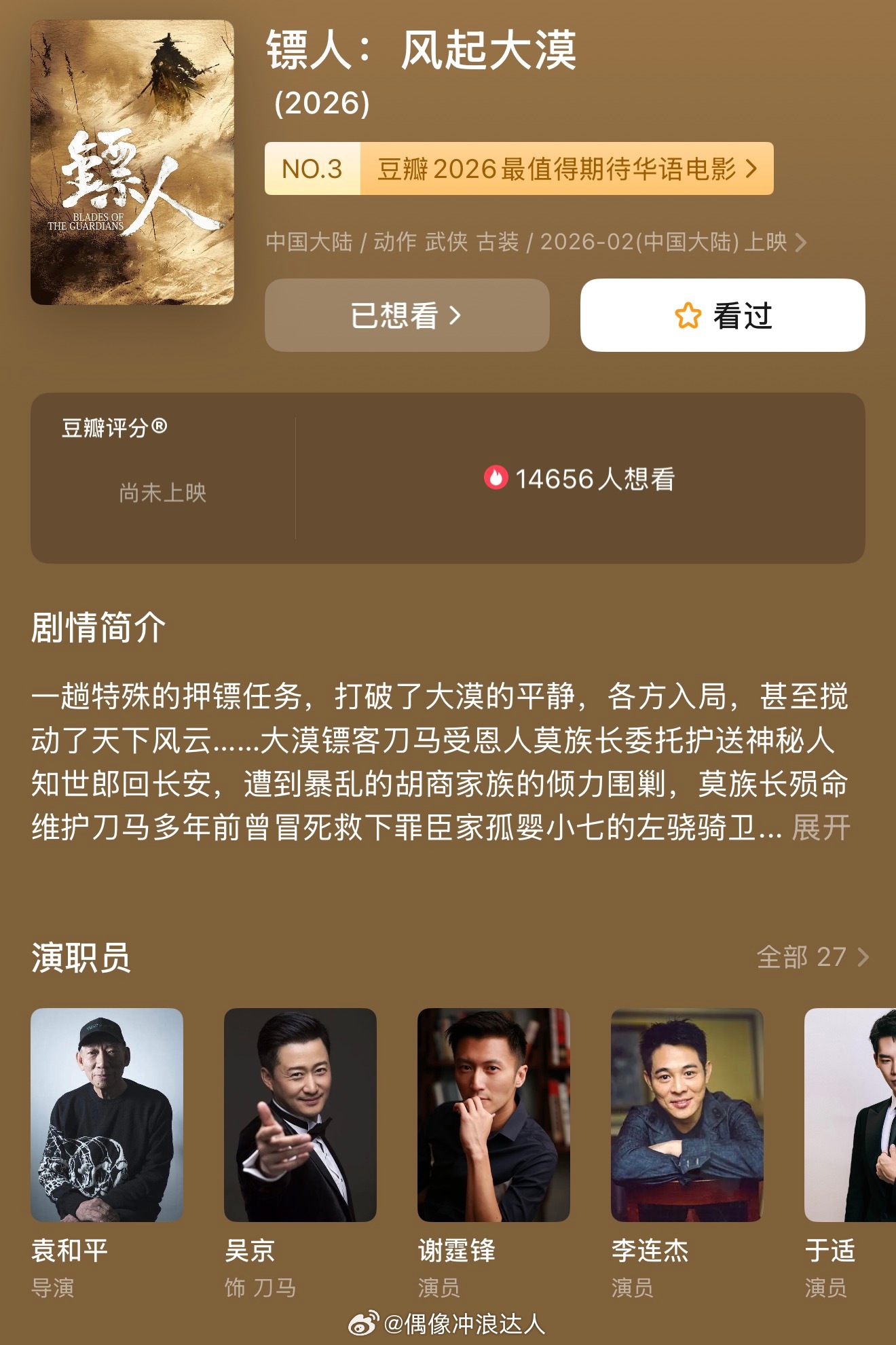 镖人 真的太期待!!吴京联手袁和平把经典国漫搬到大银幕!说真的现在武侠片稀缺,《镖人》这把不敢想动作设计会有多爽啊。吴京爆改成狂野大漠镖客,已经开始期待了!强阵容+顶级IP,血脉贲张的爽感我直接预定,武侠DNA真的动啦!