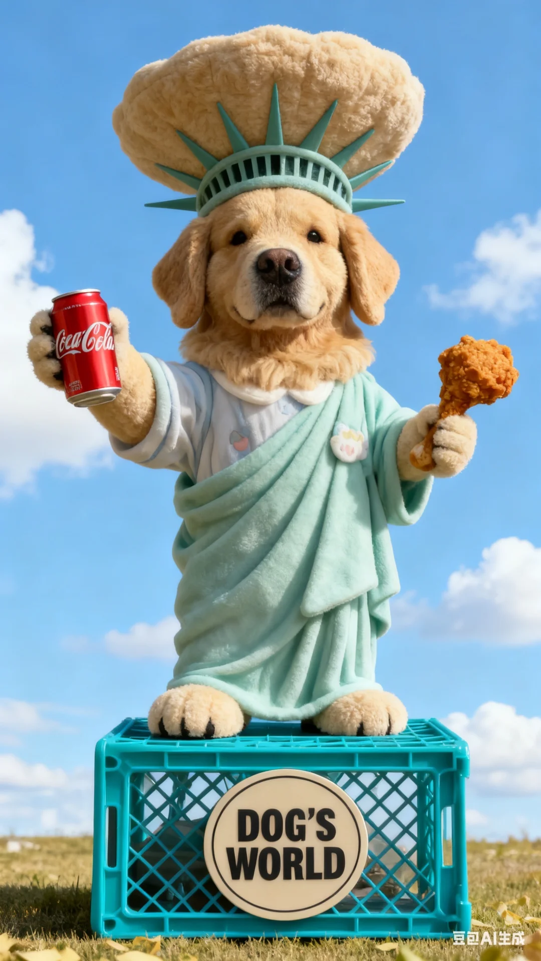 p1:帮我生成图片:原比例,真实的小狗cos自由女神,右爪举着一个罐装的可口可乐,左爪拿着一个炸鸡腿,头顶的王冠硕大与狗狗不成比例盖住头顶和耳朵,穿着可爱的衣服。表情憨厚,眼神单纯,身体皮肤毛绒质感,脚底的底座是一个蓝绿色的倒放的网格塑料框,上面有一块铭牌,用圆黑体写着“DOG‘S WORLD”,整体颜色一致为蓝绿色,呈骄傲的姿势,全身像,极致细节,大师构图,背景为蓝天白云,狗狗特征不变,脸与原图一致,真实自然风格。原比例。