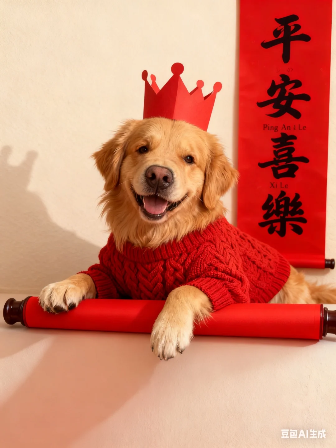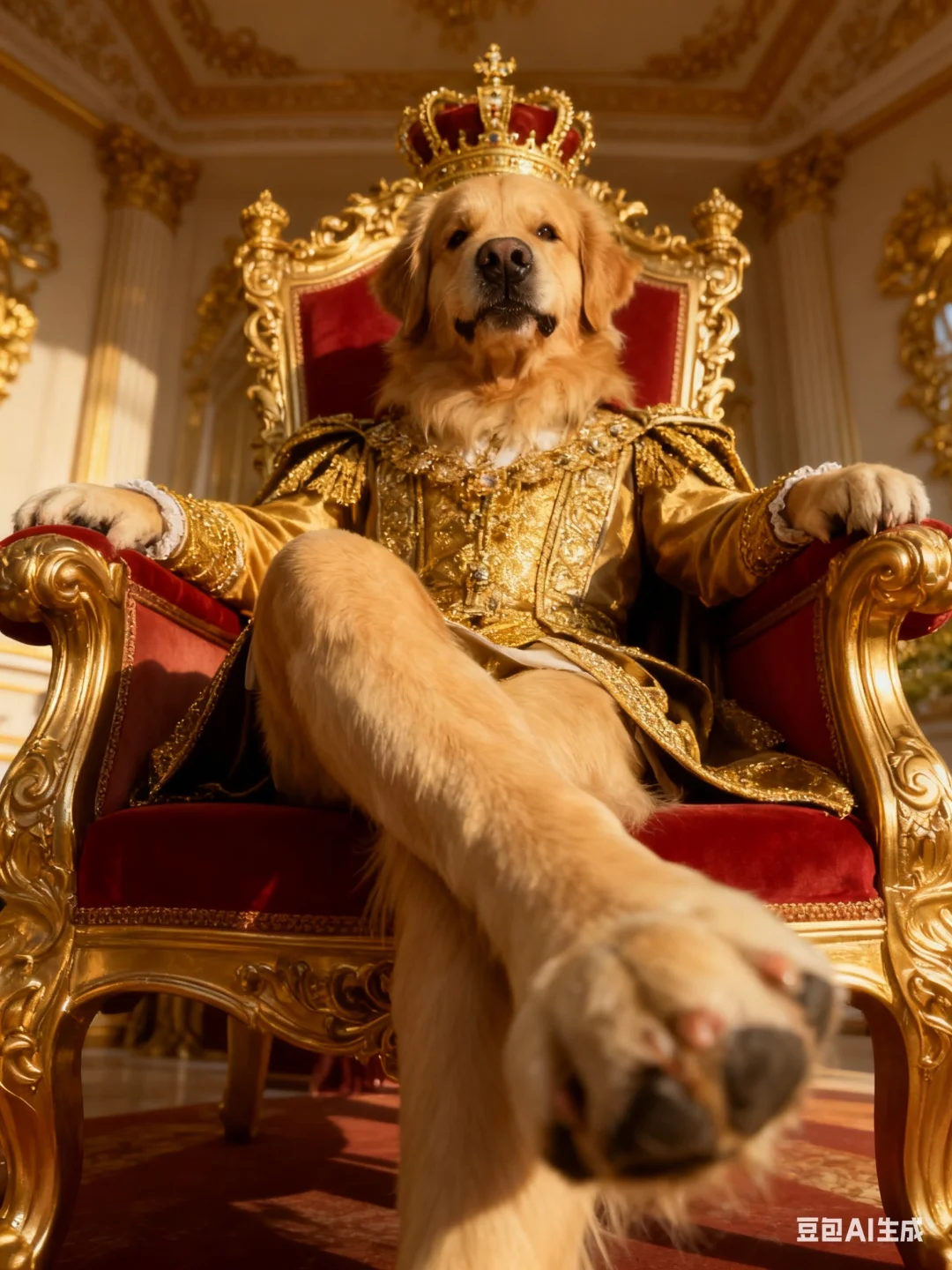 p6:帮我生成图片:让图片中的狗坐在华丽的国王宝座上,双腿交叉呈二郎腿姿势,采用近大远小构图和超广角视角,从右往上的角度拍摄,突出狗脚在画面中的主体地位以增强空间感和视觉冲击力,整体姿态调整,服装与背景增加金色装饰。原比例。