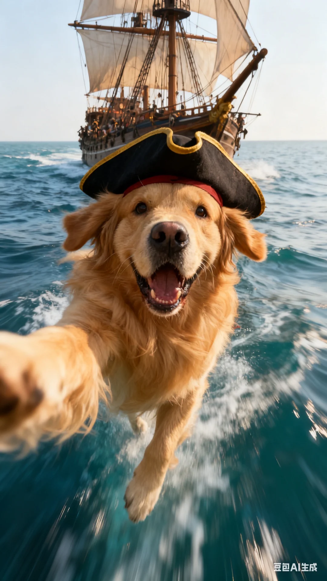 p3:帮我生成图片:生成一张仿佛抓拍瞬间的照片,画面中有一只金毛,头戴海盗帽,表情惊恐地对着相机自拍,背后是大海上的海盗船,照片有运动模糊感,以低角度视角拍摄,构图缺乏规则性,整体色调偏暖。原比例。