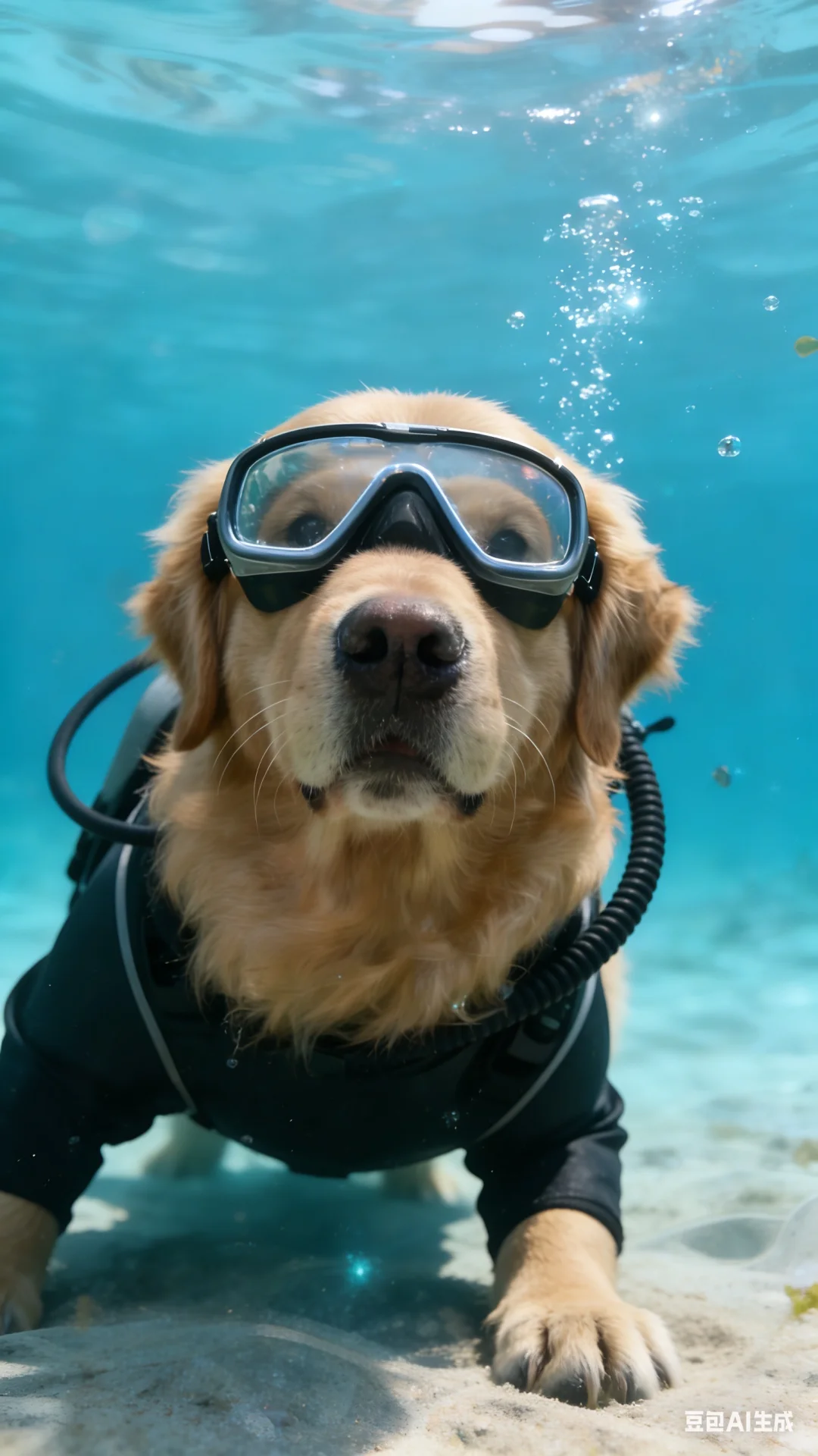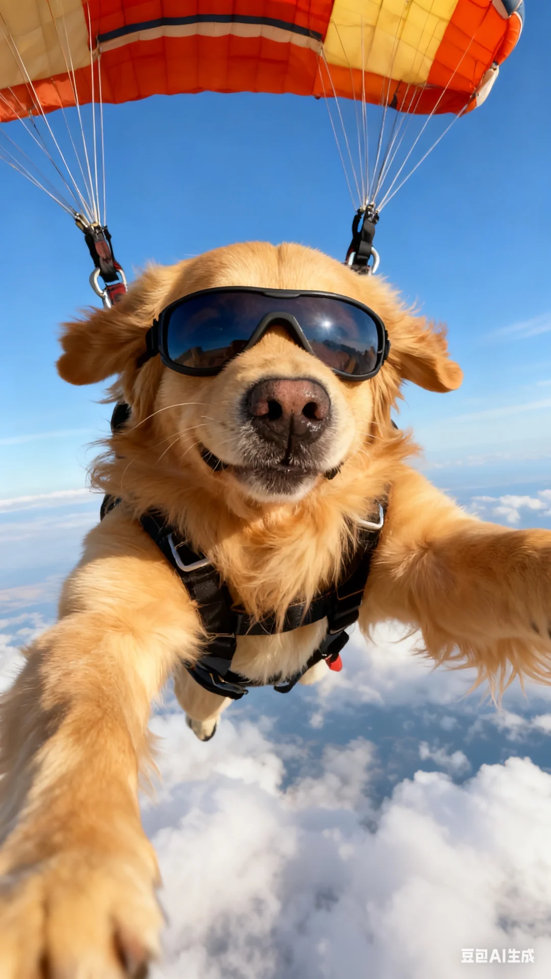 p4:帮我生成图片:运用质感光照、自然光线的写真摄影手法,画面中金毛戴着运动眼镜,处于跳伞过程,以自拍视角呈现。金毛的面部表情与我给你的图中一致,自然光线赋予其生动的质感,背景是广阔的天空,展现出一种动感与真实交织的独特氛围。比例 9:16。