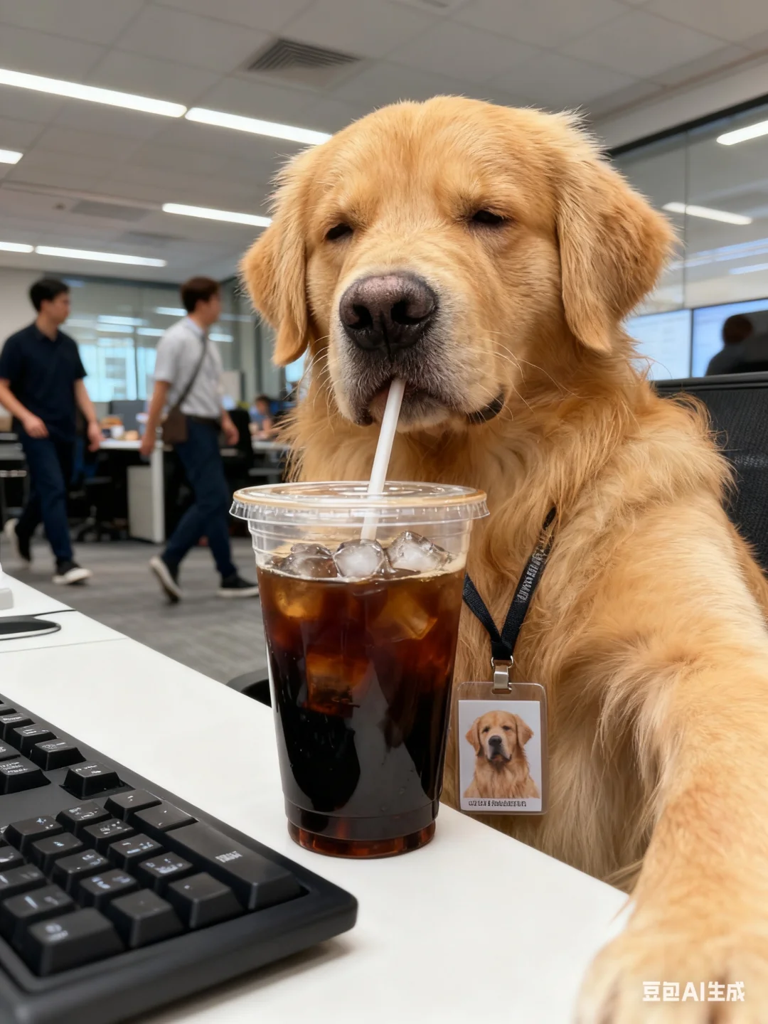 p5:帮我生成图片:保持原宠物形象,生成放松的自拍视角,宠物带着厌烦又疲惫的表情,懒洋洋地从装着黑色冰咖啡和冰块的透明外带咖啡杯中啜饮,吸管清晰叼在嘴里,脖子挂有它头像照片的挂绳工牌,工位上有键盘,背景是办公区且有走动的员工,画面为真实抓拍照片风格。原比例。