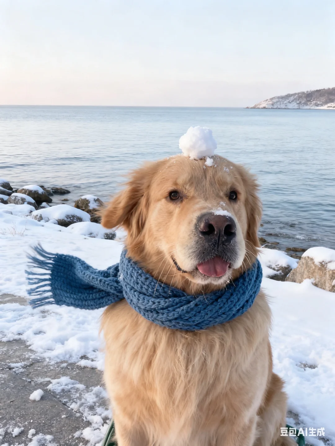 p2:帮我生成图片:将宠物主体抠出,视角拉近只露出宠物上半身,保持宠物现在的神态动作表情丝毫不要变化,头顶稳稳顶着一个小雪球,脖子上围着一条蓝色针织围巾且围巾被风吹起,背景替换为冬日海边雪景,海面平静,岸边岩石与地面覆盖皑皑白雪,整体场景柔和光线映照下呈童话般宁静美好,叠加富士滤镜,原比例。