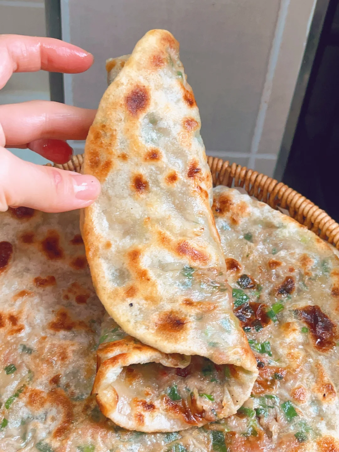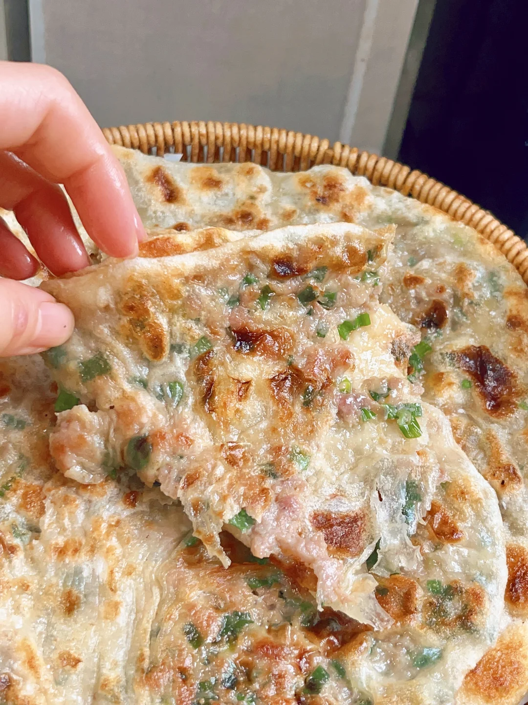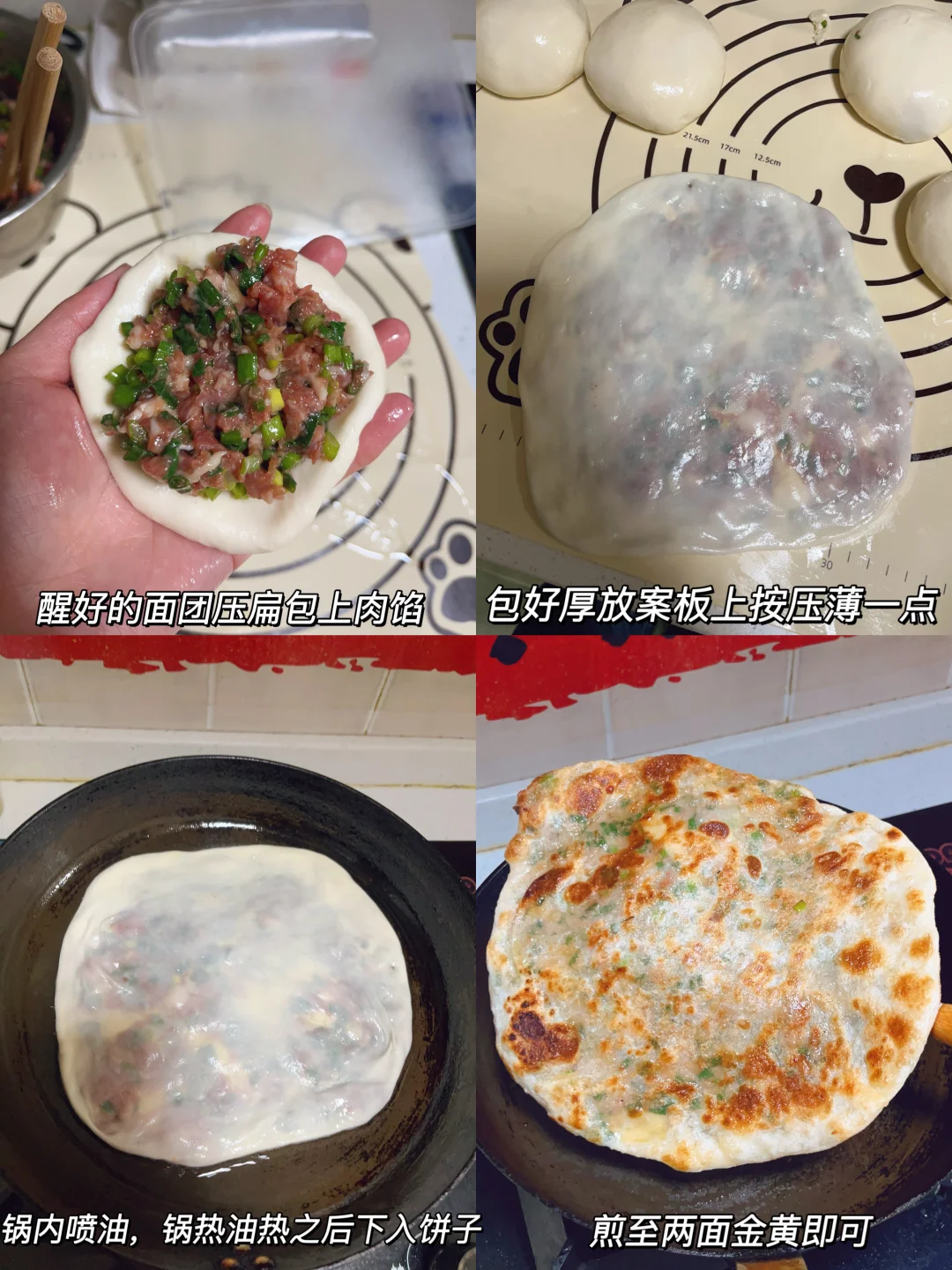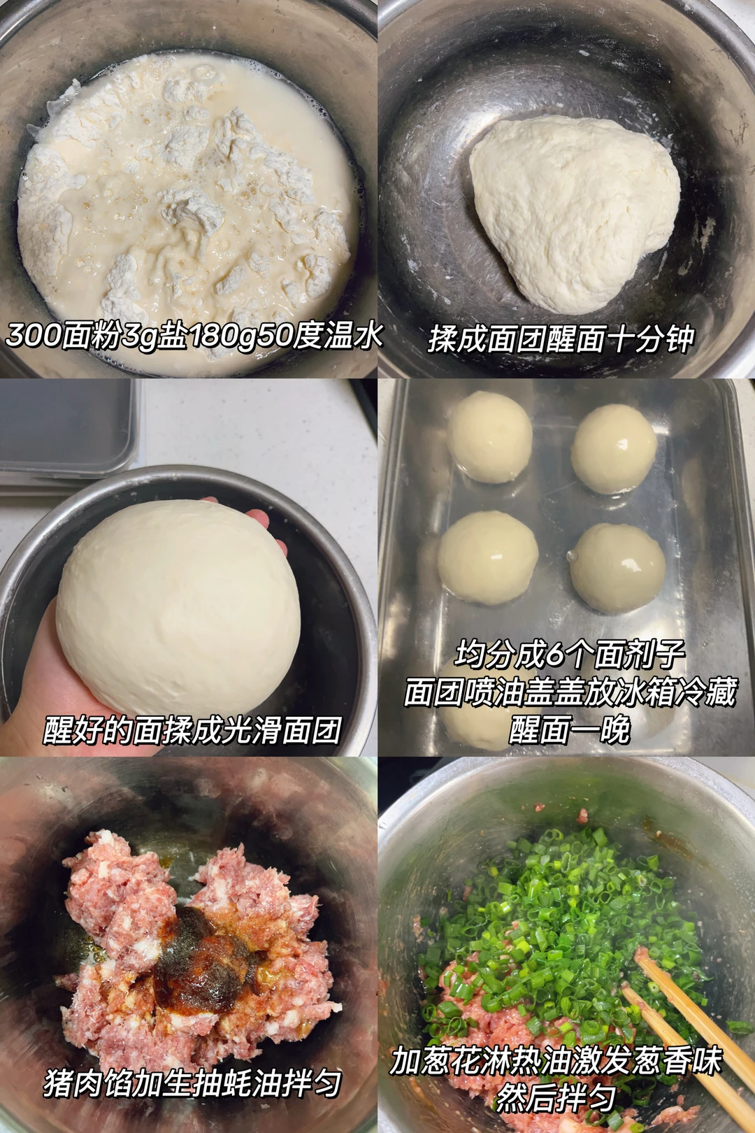 柔软又筋道,皮薄馅又多的葱香肉饼一定一定要试试,真的太香了,晚上和面,早上煎饼对于要给孩子做早餐的来说真的无比方便 [清单R]食材 300g面粉、3g盐、180g50度温水、猪肉馅、葱花 [清单R]步骤 1⃣️面粉加盐拌匀,再加18050度温水揉成面团,面团盖盖醒面十分钟再揉就会揉成光滑面团 2⃣️面团均分成6个面剂子,揉圆喷油盖上盖子放冰箱冷藏醒面一晚 3⃣️肉馅加生抽蚝油拌匀、再加葱花淋一点热油激发葱香味,拌匀肉馅 4⃣️醒好的面团用手按扁,包上肉馅,放在案板上正反面按压均匀、按薄一点 5⃣️锅内喷油,锅热油热放入饼子,中火煎至两面金黄