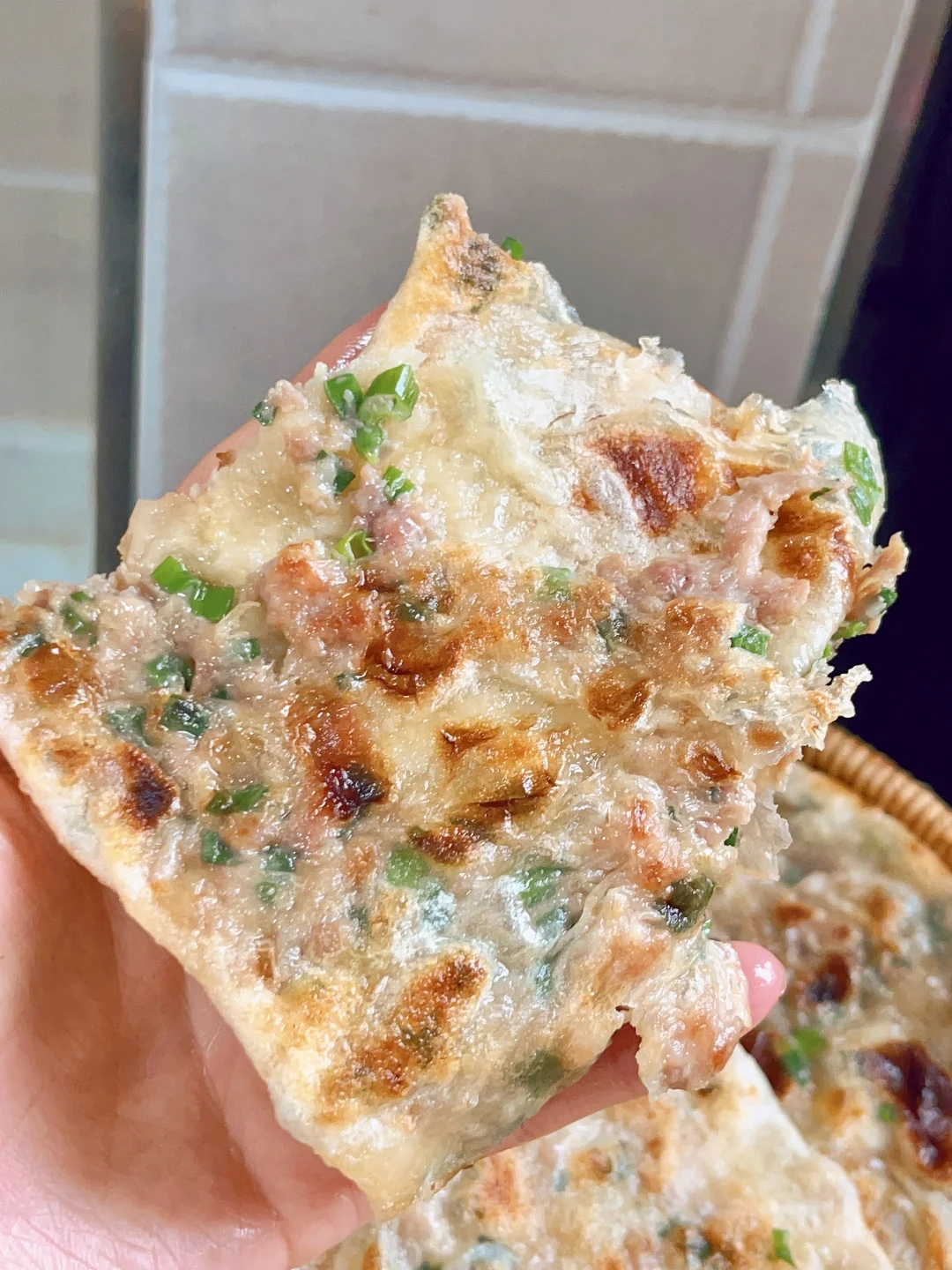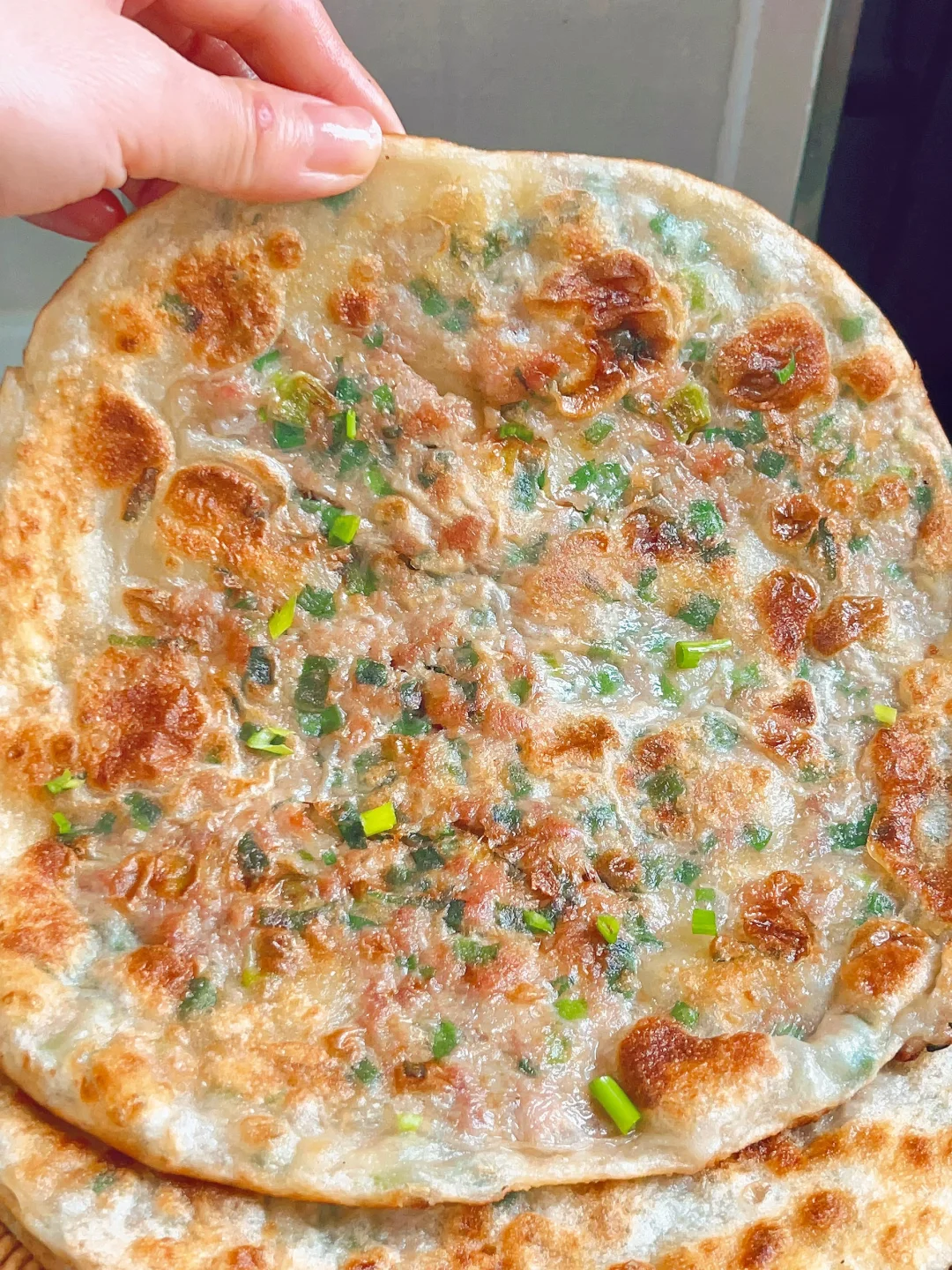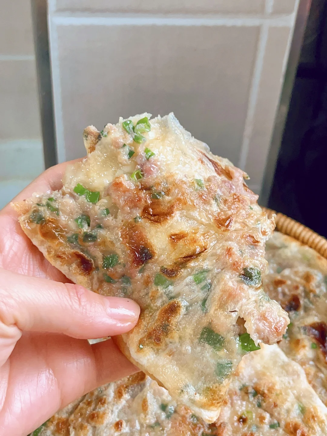 柔软又筋道,皮薄馅又多的葱香肉饼一定一定要试试,真的太香了,晚上和面,早上煎饼对于要给孩子做早餐的来说真的无比方便 [清单R]食材 300g面粉、3g盐、180g50度温水、猪肉馅、葱花 [清单R]步骤 1⃣️面粉加盐拌匀,再加18050度温水揉成面团,面团盖盖醒面十分钟再揉就会揉成光滑面团 2⃣️面团均分成6个面剂子,揉圆喷油盖上盖子放冰箱冷藏醒面一晚 3⃣️肉馅加生抽蚝油拌匀、再加葱花淋一点热油激发葱香味,拌匀肉馅 4⃣️醒好的面团用手按扁,包上肉馅,放在案板上正反面按压均匀、按薄一点 5⃣️锅内喷油,锅热油热放入饼子,中火煎至两面金黄