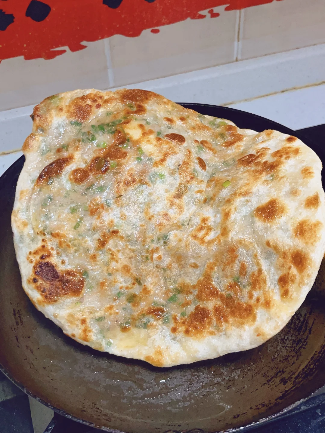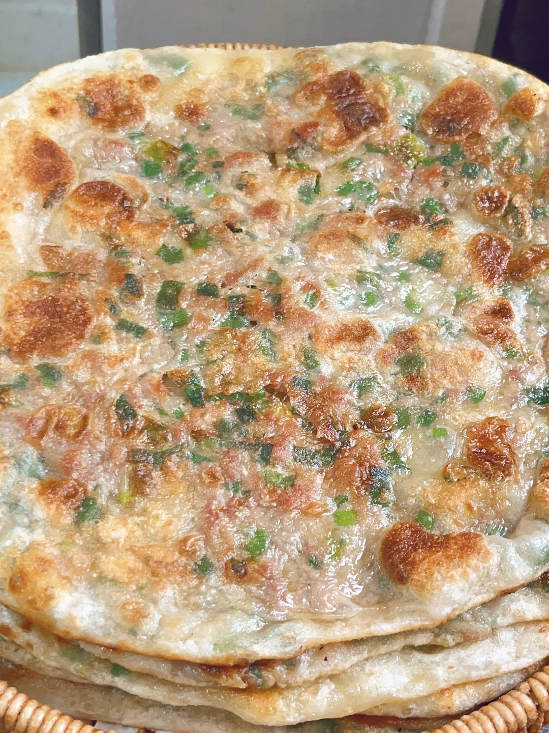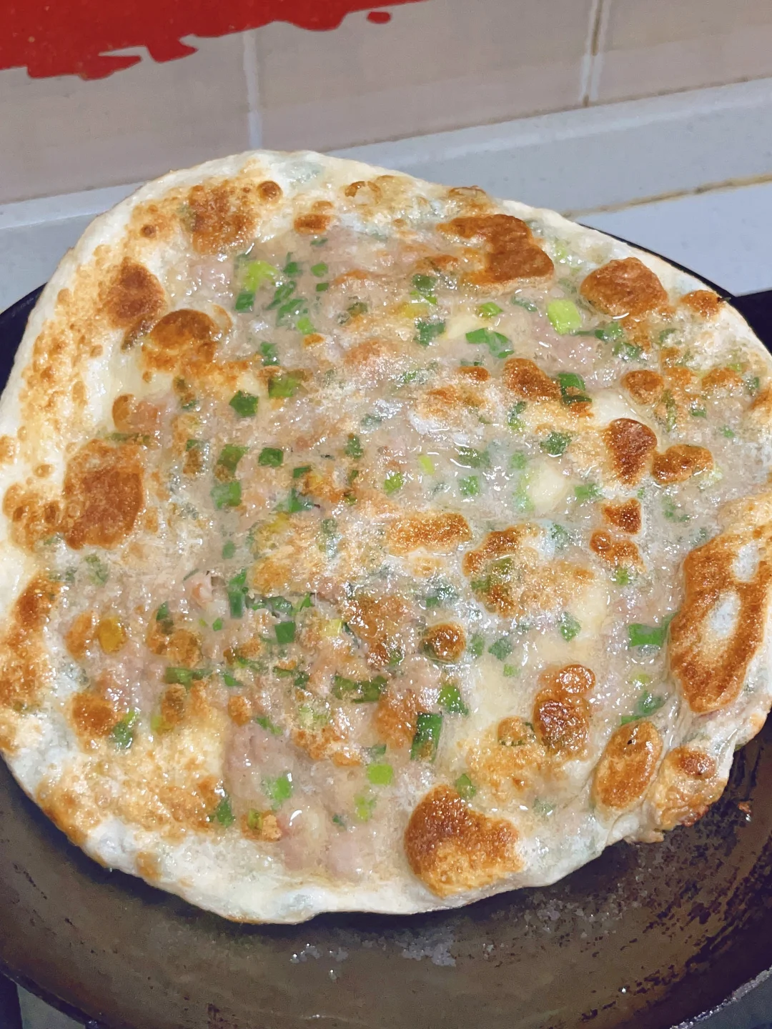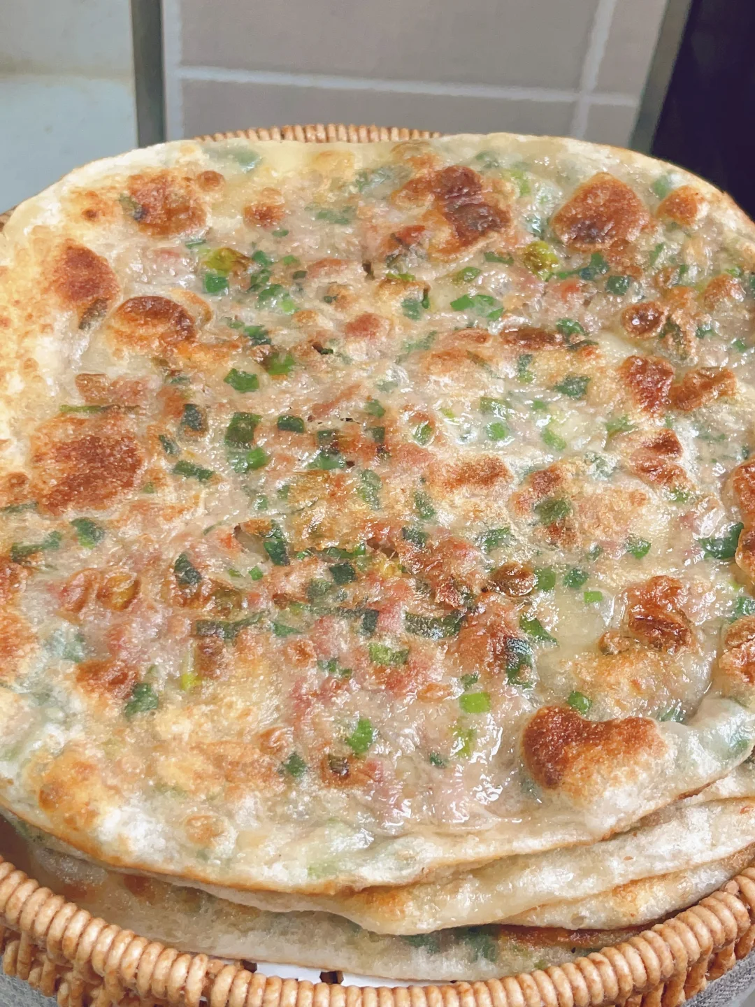 柔软又筋道,皮薄馅又多的葱香肉饼一定一定要试试,真的太香了,晚上和面,早上煎饼对于要给孩子做早餐的来说真的无比方便 [清单R]食材 300g面粉、3g盐、180g50度温水、猪肉馅、葱花 [清单R]步骤 1⃣️面粉加盐拌匀,再加18050度温水揉成面团,面团盖盖醒面十分钟再揉就会揉成光滑面团 2⃣️面团均分成6个面剂子,揉圆喷油盖上盖子放冰箱冷藏醒面一晚 3⃣️肉馅加生抽蚝油拌匀、再加葱花淋一点热油激发葱香味,拌匀肉馅 4⃣️醒好的面团用手按扁,包上肉馅,放在案板上正反面按压均匀、按薄一点 5⃣️锅内喷油,锅热油热放入饼子,中火煎至两面金黄
