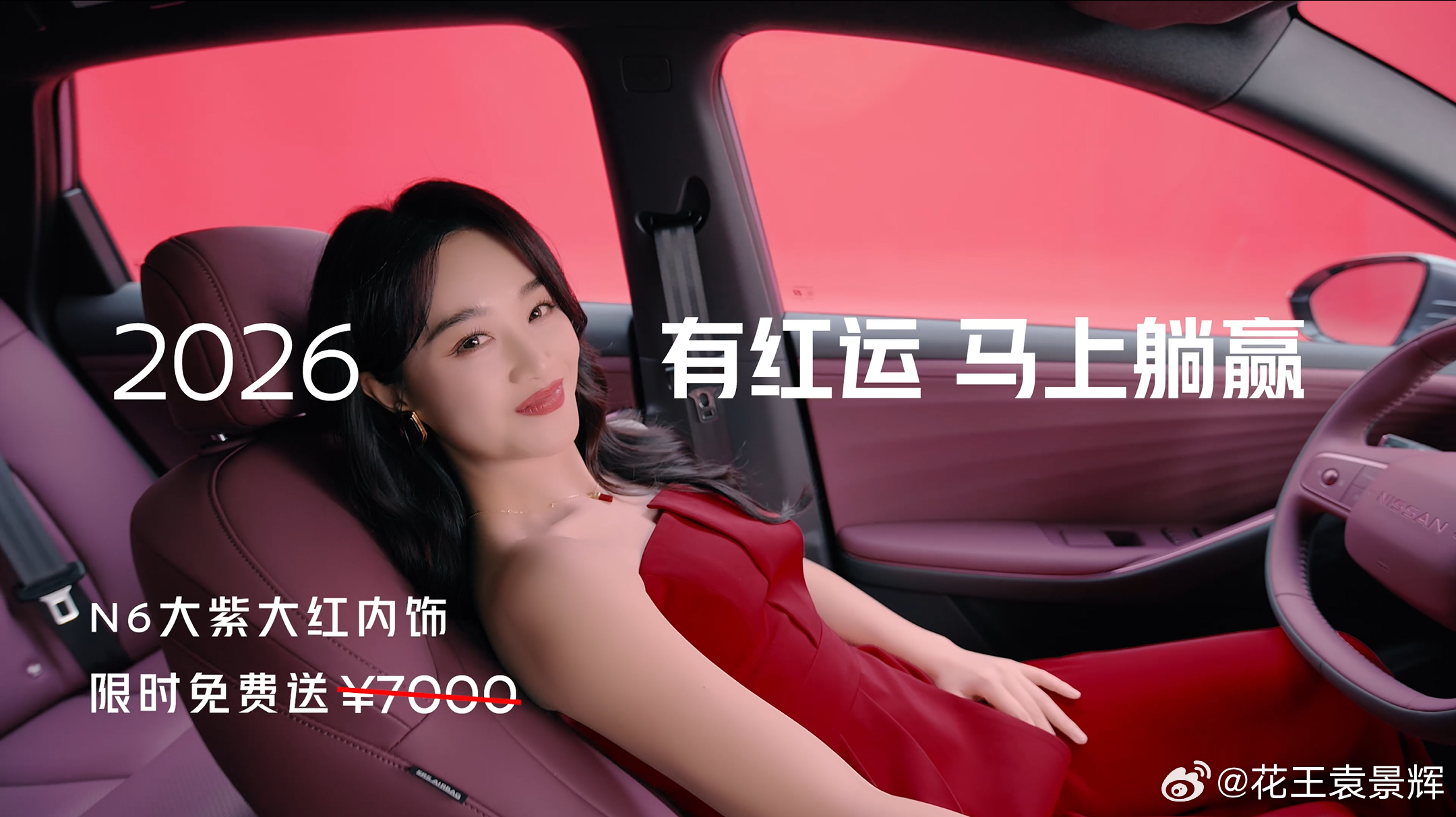蓝盈莹开N6红运当头新年开大紫大红大N6马上就到农历新年了,不少人开始盘算要开一台车回家过年了,那么有没有一台家人坐进去都能满意的好车呢?360°环抱式座舱,整车内饰采用高级拼色设计,大紫大红的内饰色,大展红图,紫定暴富!11.5㎡大面积软包覆盖,所触皆柔软。材质方面健康耐用,高频触感分区采用凝脂材质,媲美Nappa真皮触感,冬暖夏凉,且耐磨耐污,能有效抵御各种污渍的侵扰。并且日产N6更懂爱家人的您,座舱材质更获得OEKO-TEX® STANDARD 100母婴级亲肤认证及中汽中心零甲醛认证,告别异味,红光满面,紫定健康材质舒服也要坐得舒适,那就不得不提日产的大沙发了!日产N6搭载了前后排零压云毯沙发,结合了日产独有Spinal人体工学座椅造型,还有14向电动调节,怎么坐都舒适。并且还有“自适应体态”AI算法,根据体型和体态自动提供量身定制的最贴合支撑,加上全身SPA级12点按摩,通风加热齐上车,百万级舒适通勤无负担,长途不疲惫,落座即舒压。红福齐天,紫定幸福!日产N6开年即“大红大紫”!是鸿运当头,紫薇照命的吉兆。开年限定大紫大红内饰色上新,选装价7000元限时免费送!这个农历新年,开着日产N6回家,让好运从驾驶舱开始出发!有兴趣的老板们可以去门店试驾一下!