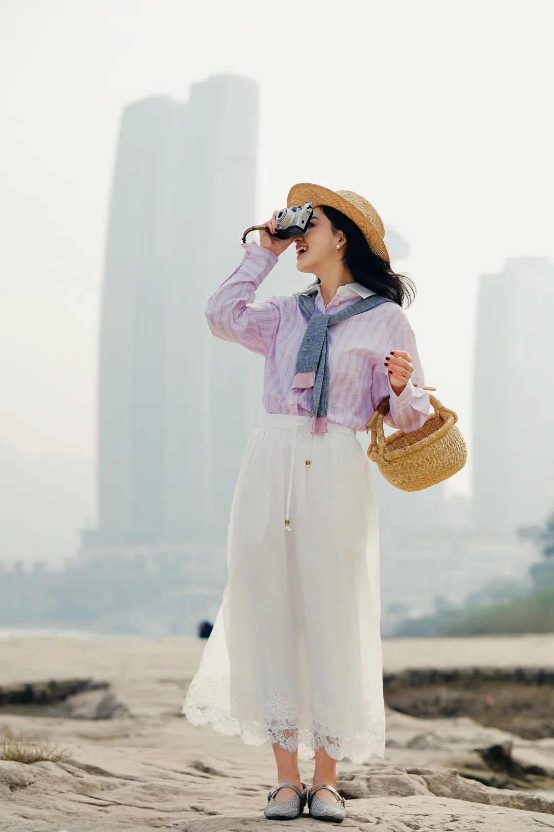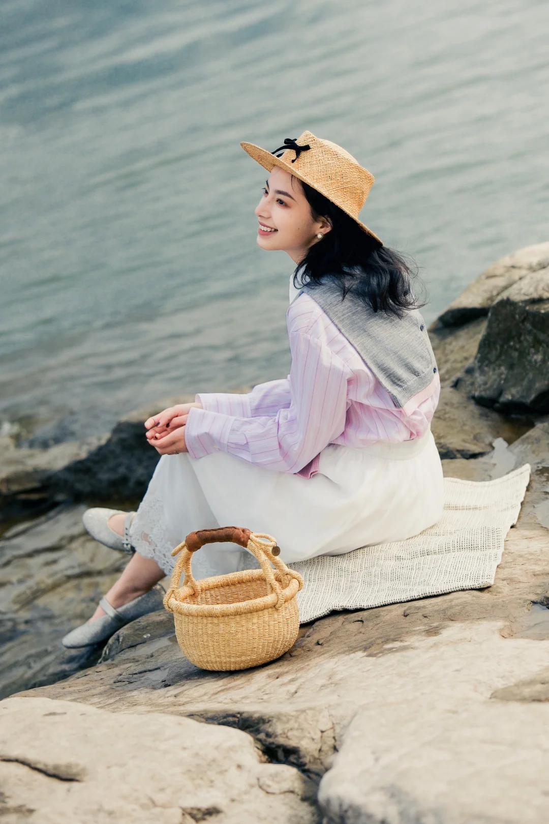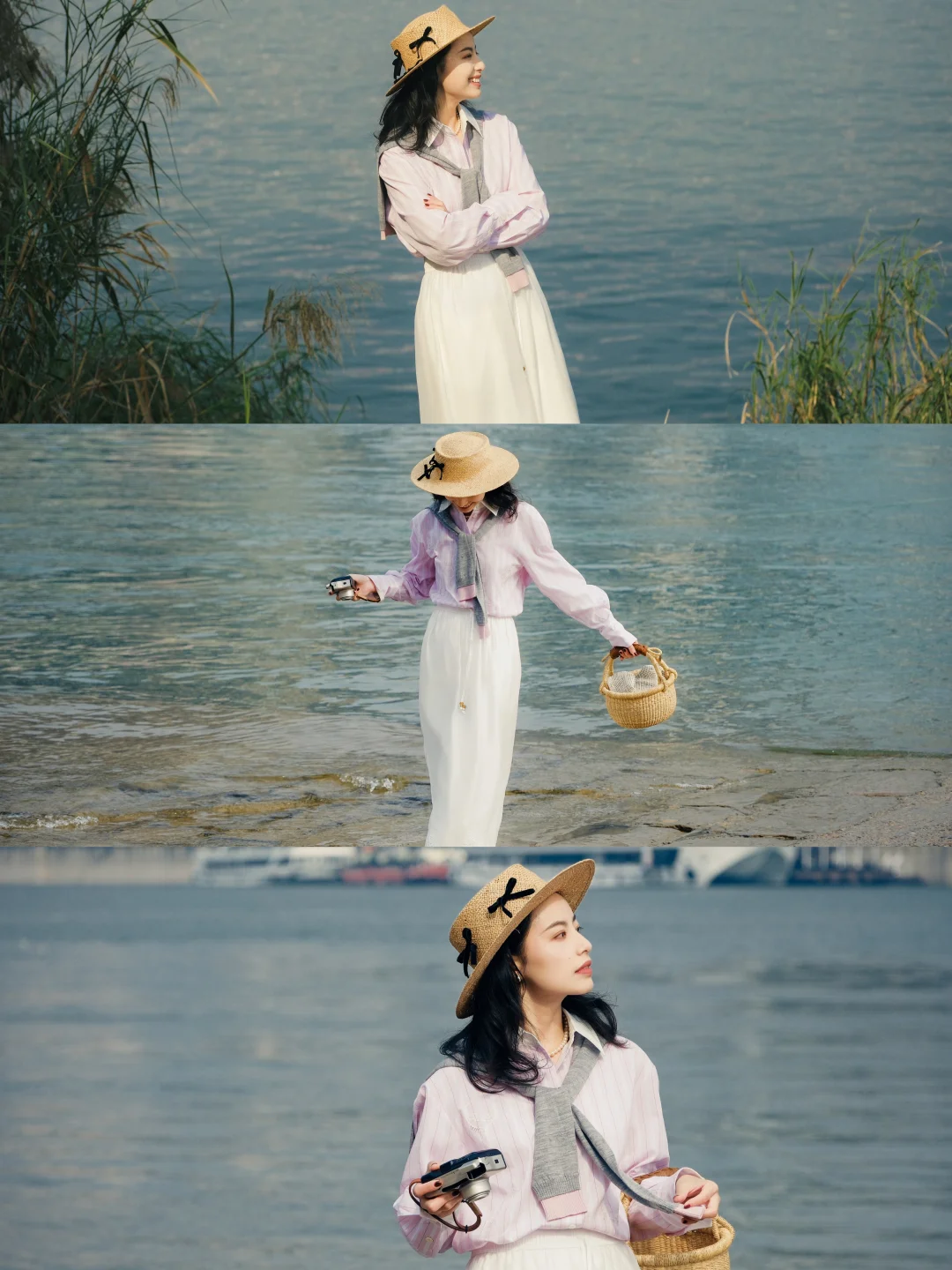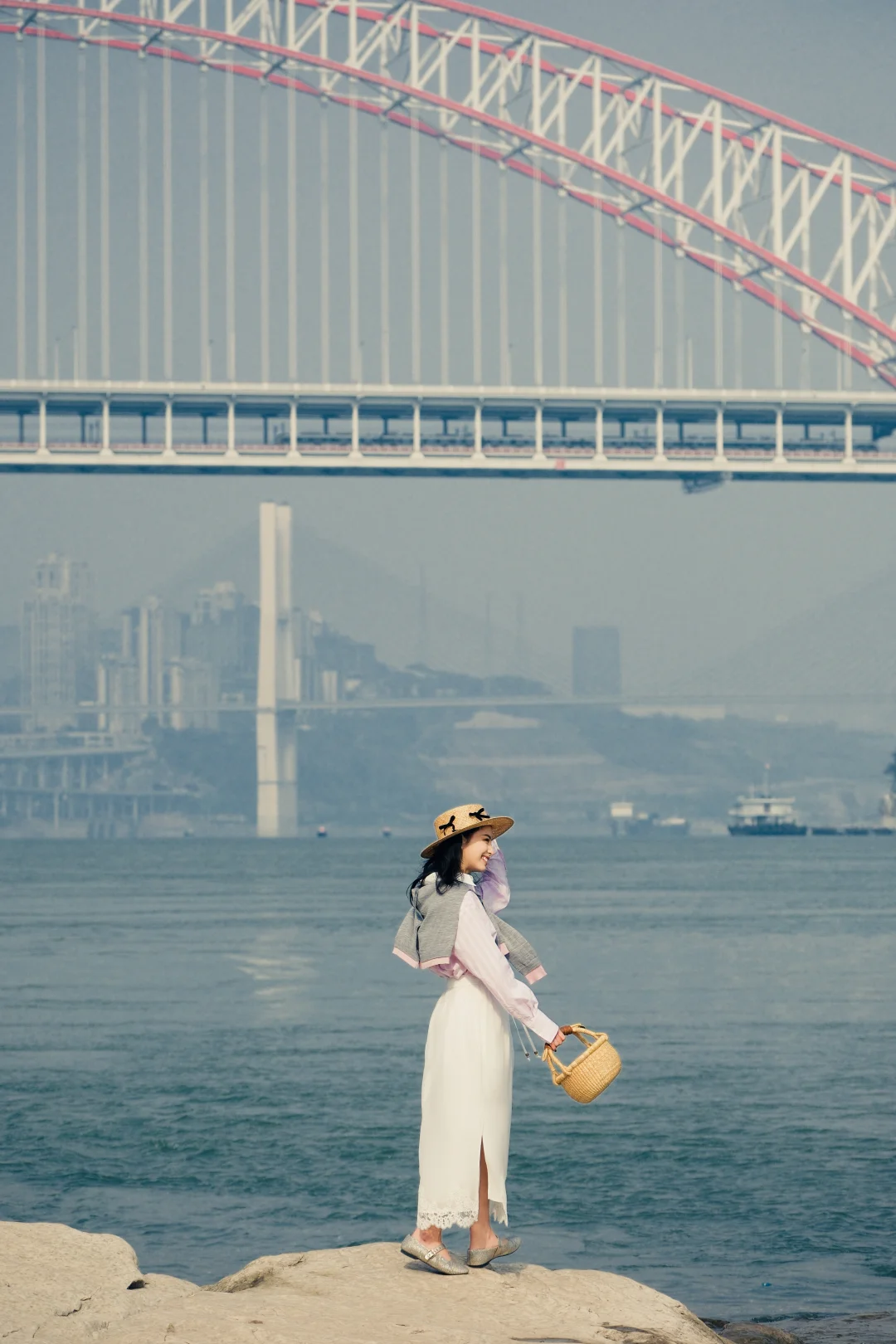 2️⃣可以找一处江边的石滩,注意看一下石滩的线条,人坐在石滩上用江水做背景也很好看