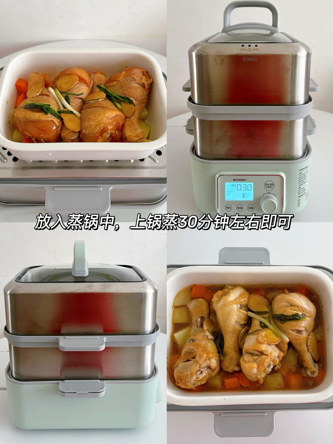 3️⃣.炒好的蔬菜丁放入蒸碗中,放上腌制好的鸡腿,放入蒸锅中蒸30分钟