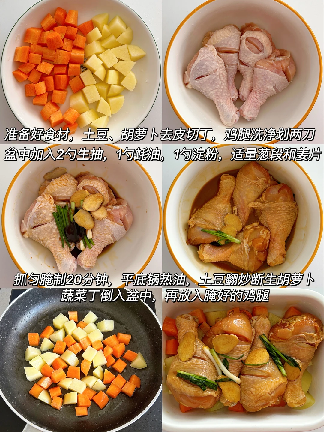 1️⃣.胡萝卜、土豆洗净去皮切丁备用,鸡腿洗净表面划2刀,加2勺酱油、1勺蚝油、1,勺淀粉,少许葱段姜片抓匀腌制30分钟
