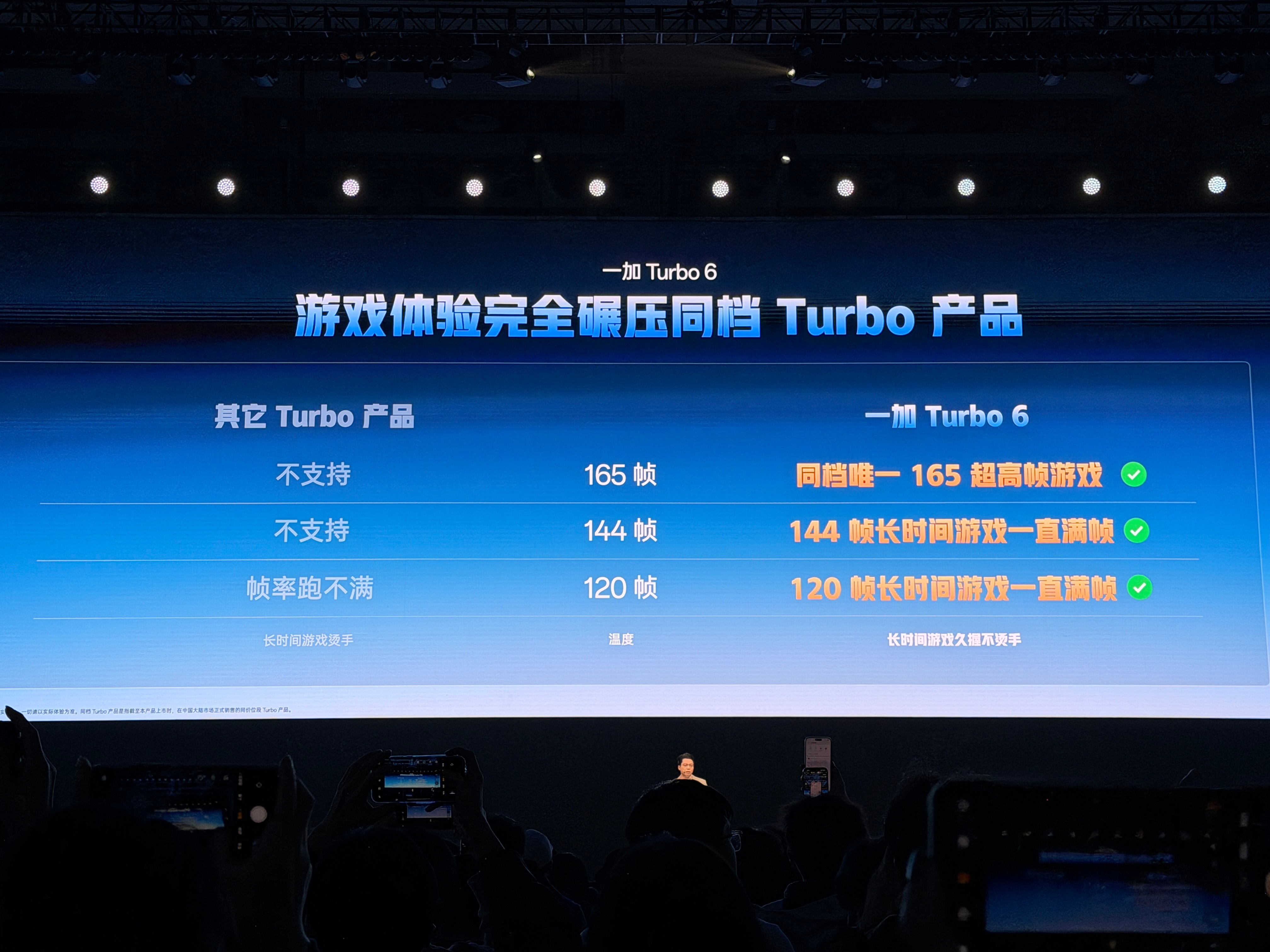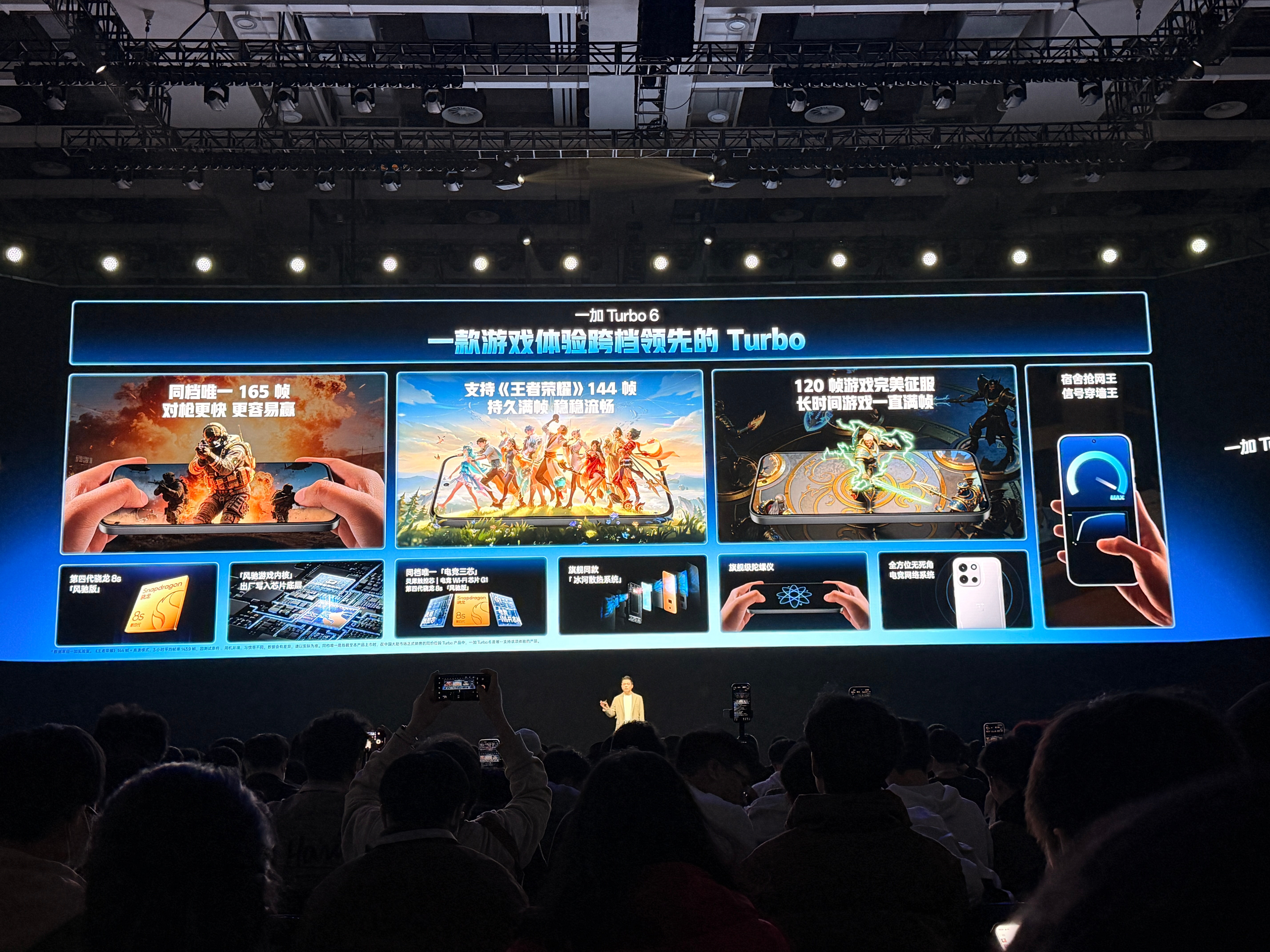 一加 Turbo 6 搭载了专门调优的骁龙 8s Gen 4。虽然在极限多核性能上略逊于顶级旗舰(如一加 15 搭载的骁龙 8 Gen 5),但在能效比上非常出色在《王者荣耀》、《和平精英》中可以稳定开启 165Hz 超高帧模式,配合“风驰游戏内核”,帧率波动极小一加turbo6 在《原神》《崩坏:星穹铁道》的横屏测试中,Turbo 6 能在最高画质下稳定在 60 帧,且得益于大电池和散热,长达 2 小时的测试后降频现象并不明显9000mAh 巨量电池 这是该机最大的杀手锏。在目前的横评中,一加 Turbo 6 的续航表现几乎是行业断层领先 实测横屏重度游戏续航可达 8-10 小时以上,远超同档位竞争对手的 5-6 小时 虽然电池极大,但一加通过高倍率快充技术平衡了回血速度,同时也支持 27W 的有线反充,关键时刻可以当充电宝用而专门针对横屏握持设计,圆润的边角在长时间打游戏时不会顶手掌,手感接近旗舰级产品 后置镜头模组(Deco)仅 1.7mm,横屏握持时食指几乎感受不到硌手尤其高刷带来的跟手度配合“灵犀触控芯”,在 FPS 手游中的开镜、转身动作反应极快。如果你是重度游戏用户 一加 Turbo 6 的 165Hz 屏幕 + 9000mAh 电池 组合目前在市场上没有直接对手,非常适合“不带充电宝出门”且追求极致流畅度的玩家 珠海·珠海国际会议中心