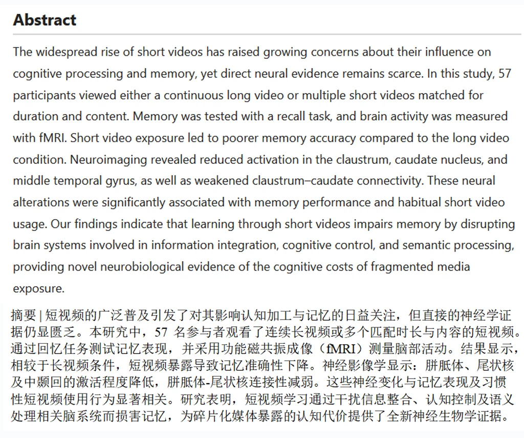 这项研究提醒我们,在需要通过视频进行系统性学习时,连续、完整的长视频可能是更优的选择;而对于日常刷短视频的习惯,也需注意节制,给大脑留出深度处理信息的时间。