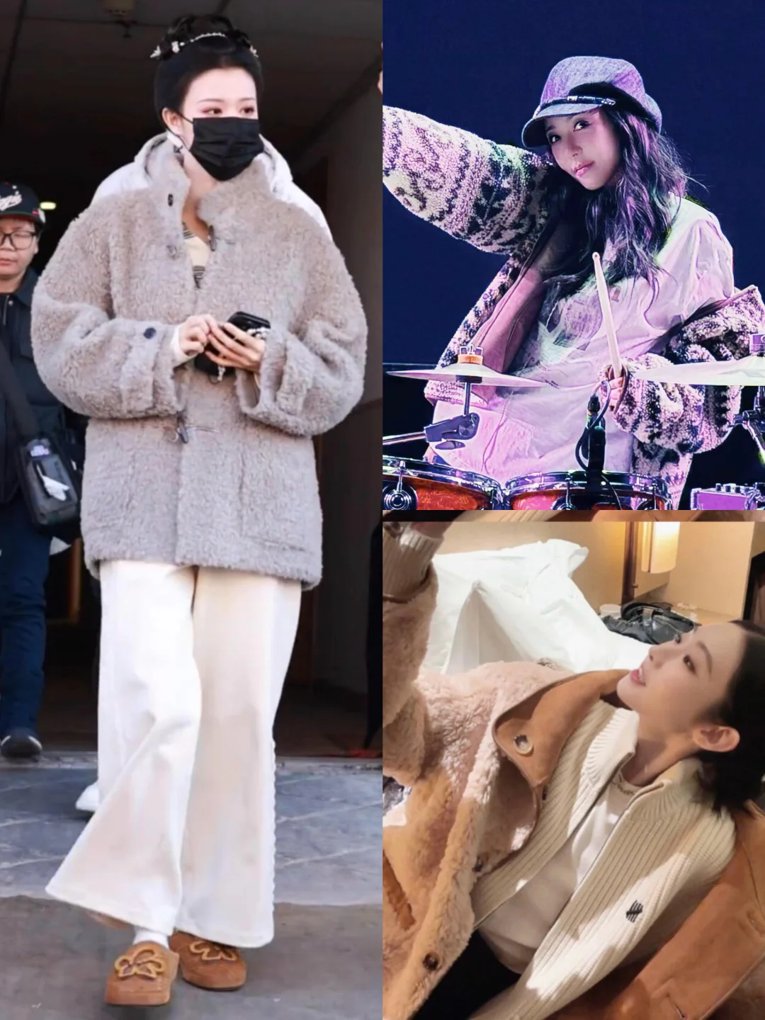 佘诗曼的叠穿公式,把“松弛感”焊在了身上!一件白色羊羔毛外套,内搭简约的连