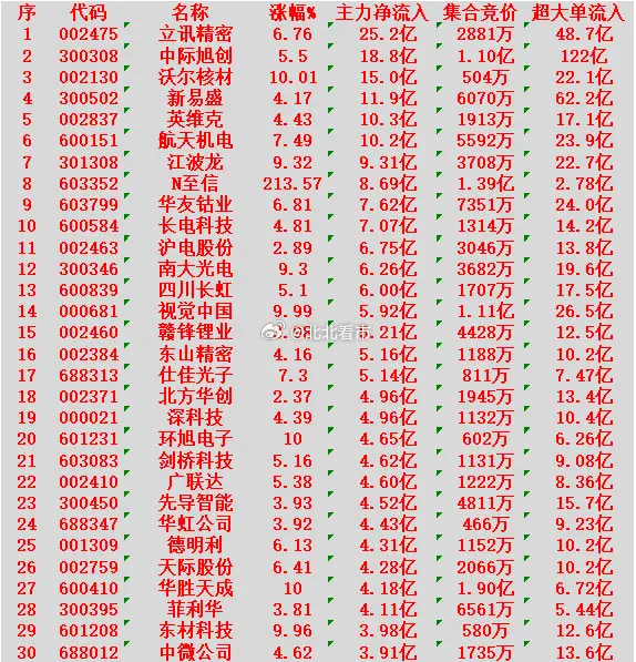 1月15日收盘,主力资金,已经大幅卖出的30名单:蓝色光标:净流出 30.9亿元山子高科:净流出 26.0亿元东方财富:净流出 17.2亿元岩山科技:净流出 15.8亿元金风科技:净流出 15.7亿元航天电子:净流出 13.3亿元中国卫星:净流出 12.2亿元利欧股份:净流出 11.2亿元平潭发展:净流出 10.7亿元润泽科技:净流出 10.0亿元1月15日收盘,主力资金“大幅买入”的30名单:立讯精密:净流入 25.2亿元中际旭创:净流入 18.8亿元沃尔核材:净流入 15.0亿元新易盛:净流入 11.9亿元英维克:净流入 10.3亿元航天机电:净流入 10.2亿元江波龙:净流入 9.31亿元N至信:净流入 8.69亿元华友钴业:净流入 7.62亿元长电科技:净流入 7.07亿元沪电股份:净流入 6.75亿元南大光电:净流入 6.26亿元四川长虹:净流入 6.00亿元视觉中国:净流入 5.92亿元赣锋锂业:净流入 5.21亿元东山精密:净流入 5.16亿元仕佳光子:净流入 5.14亿元北方华创:净流入 4.96亿元深科技:净流入 4.96亿元环旭电子:净流入 4.65亿元