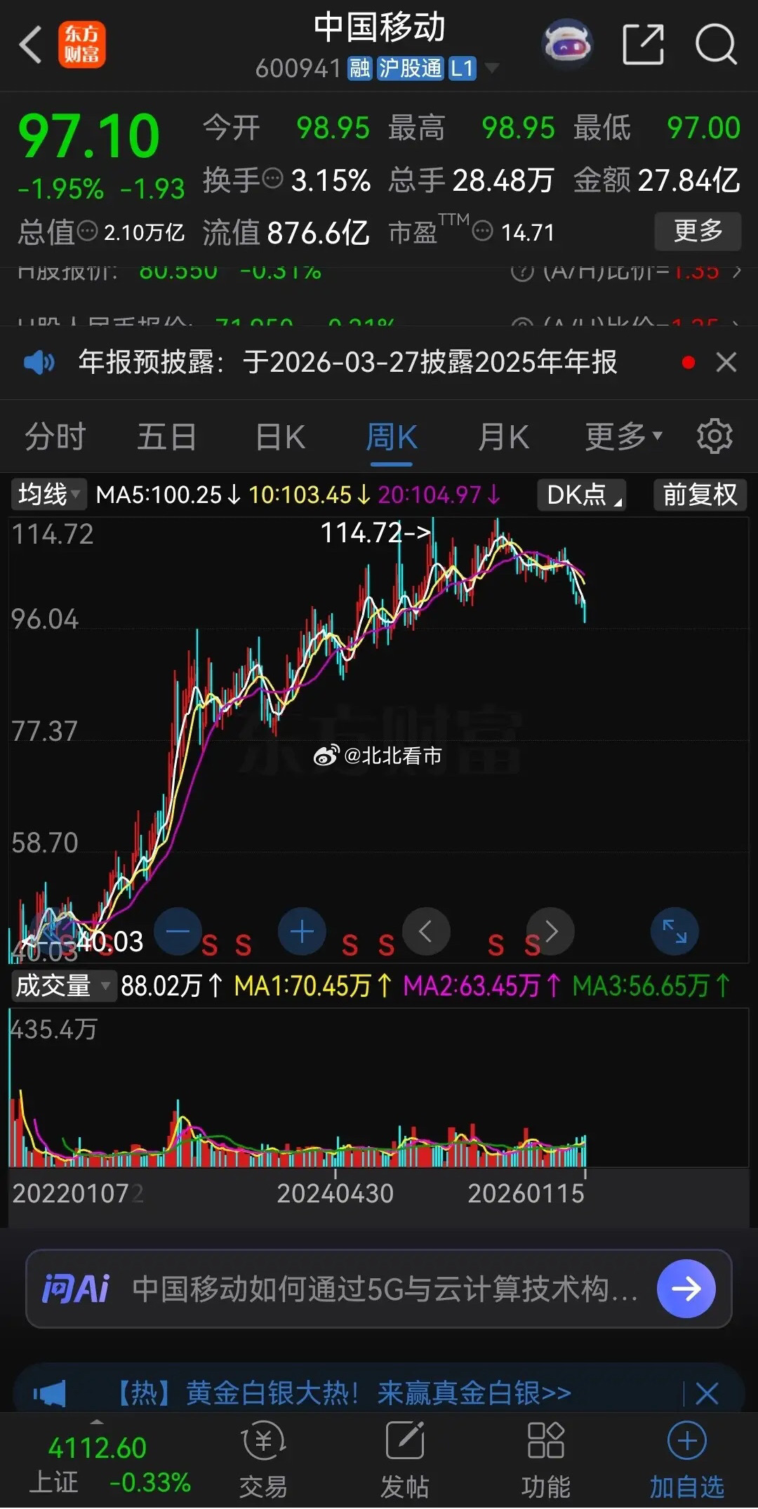 这会不会是第二个大秦铁路?中国移动从去年6月份就开始一路单边下跌,进入11月底后更是一路崩盘式下跌,最近两天连续放量收出大阴线,截至今天收盘股价报收于97.10元,已经跌破百元大关。公司是好公司,一年两次分红,去年10派22.916元和10派25.025元,股息率达到了4.83%,和大秦铁路股息率差不多。不过这走势已经彻底破位,目前已经较高点下跌了19%,把K线拉长看,股价还在山顶,毕竟从40元涨上来,仍然还在一倍多的涨幅。我有一种预感,持有这种高股息的大盘蓝筹,可能会完全错过这轮大牛市,吃了多少股息到时可能都会加倍吐出来!