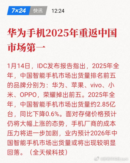 2025全年出货量排名,华为以4670万台+市场份额16.4%,成功重返中国市场第一名凭借着华为Mate80、Mate70系列、华为Mate X7、华为 Pura 70、Pura 80 系列、nova13、nova14、nova15 系列、畅享80系列良好的销量出货华为手机重返中国市场第一华为2025年中国智能手机出货量第一