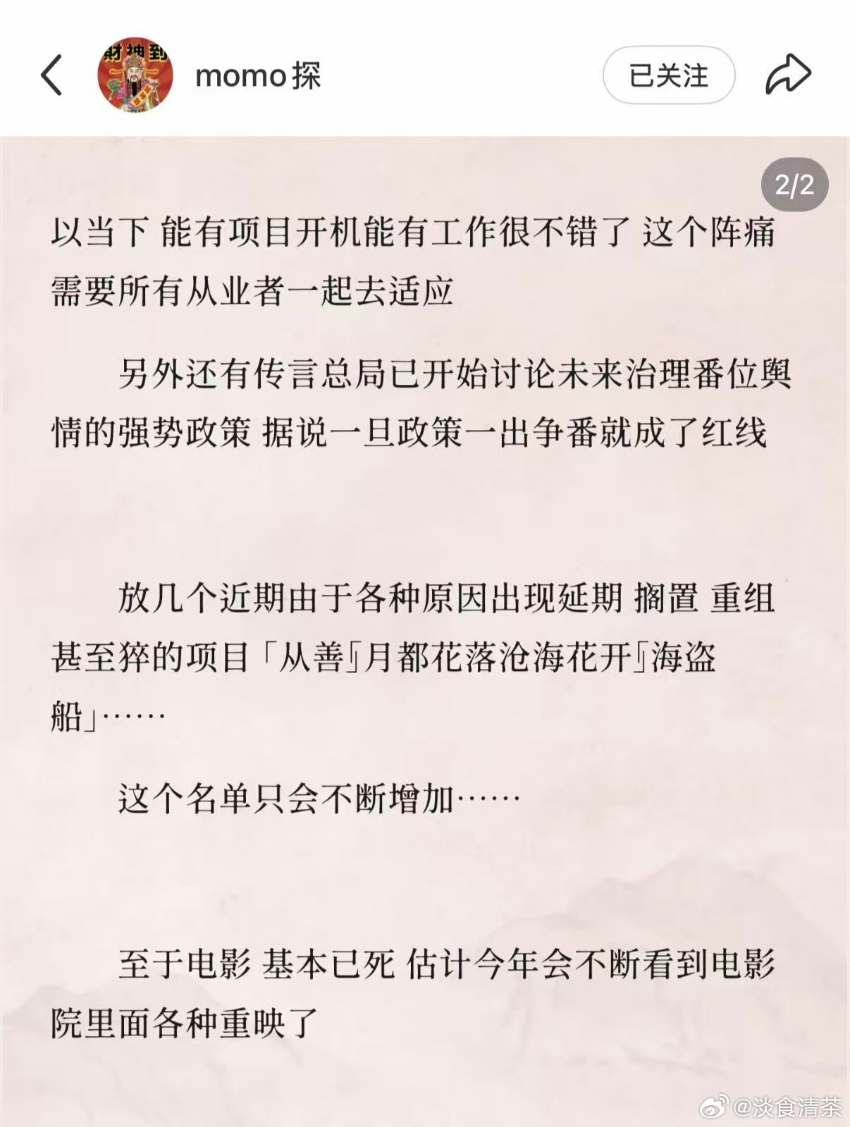 瓜主料1.“另外还有传言,总局已开始讨论未来治理番位舆情的强势政策,据说一旦政策一出,争番就成了红线”2.“至于电影,基本已死,估计今年会不断看到电影院里面各种重映了”3.“导演、编剧、主演阵容、主创等核心项目人员要不就是绝对顶级,要不就是特别适配,而且一剧一平台一议,但总的来讲,就是降价降价再降价,提高项目成功率,看重质量不看重数量。 4.“当下能有项目开机能有工作很不错了,这个阵痛需要所有从业者一起去适应。放几个近期由于各种原因出现延期、搁置、重组甚至猝的项目——《从善》《月都花落沧海花开》《海盗船》。这个名单只会不断增加”